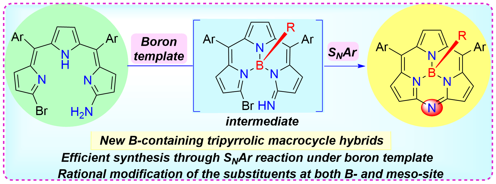 卟啉及其类似物广泛存在于自然界中,被誉为“生命色素”,在生物体内有着重要的生物功能,如:氧化还原过程(细胞色素)、光合作用(叶绿素),氧气传输(血红素)等。近年来,一些特殊结构的卟啉类化合物——如缩环卟啉、异构卟啉和扩展卟啉等,逐渐引起了化学家们的关注,成为卟啉化学中新的研究热点。亚卟啉是由三个吡咯环和三个次甲基依次交替连接而成的一类缩环卟啉。它具有独特的碗状结构,是具有14π电子芳香体系。尽管从结构上看,亚卟啉比普通的卟啉环更简单,但是其合成却具有非常大的挑战性。自2006年苯并亚卟啉首次成功合成以来,尽管科学家们做了很多努力,亚卟啉的合成仍然存在通用性差,步骤繁琐,产率低,分离难度大等缺点。最重要的是,亚卟啉杂化体仍缺乏有效合成手段。