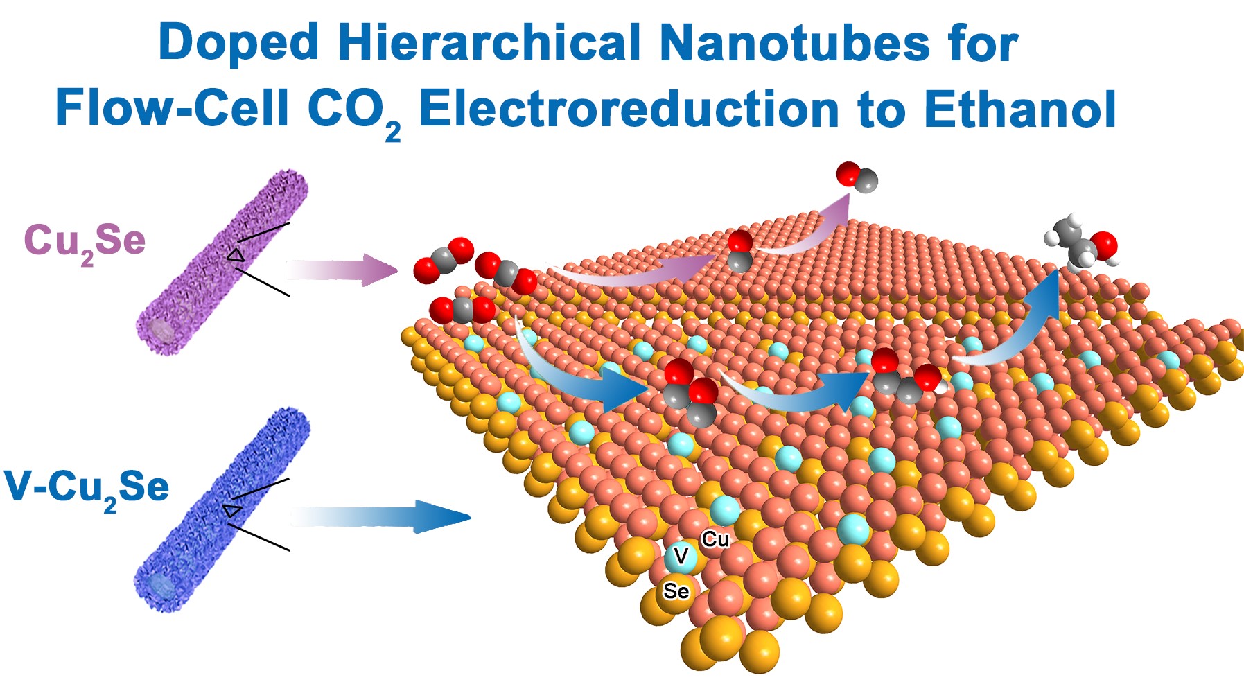 吴正翠教授、盛天副教授合作在流动池电催化二氧化碳转化材料研究领域取得重要进展。该成果以“V-Doped Cu2Se Hierarchical Nanotubes Enabling Flow-Cell CO2 Electroreduction to Ethanol with High Efficiency and Selectivity”为题发表在国际材料类顶刊Advanced Materials上(原文链接: //doi.org/10.1002/adma.202207691)。