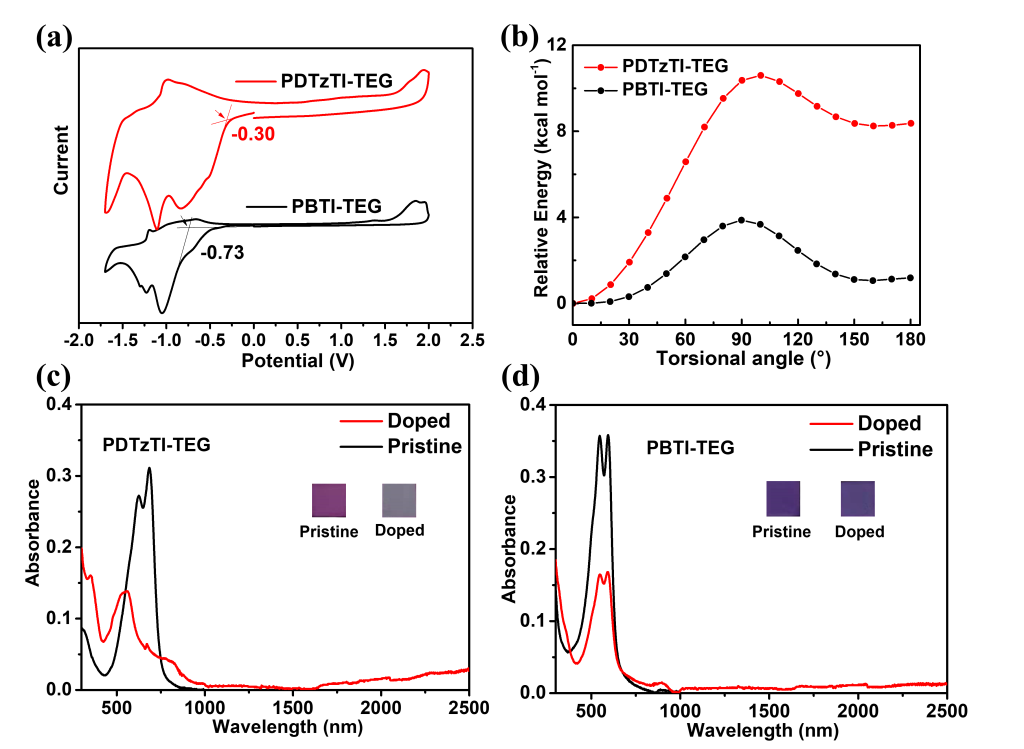 史永强课题组与东华大学孙恒达教授、瑞典林雪平大学Simone Fabiano教授和南方科技大学郭旭岗教授合作,合成了含有极性侧链的噻唑酰亚胺构建单元,并在此基础上得到了全受体均聚物PDTzTI-TEG。含有极性侧链噻唑酰亚胺的合成与之前报道的含有普通烷基链噻唑酰亚胺的合成完全不同,极性侧链受体单元的合成更具有挑战性。DTzTI-TEG单体的成功合成丰富了聚合物结构的多样性,尤其是受体-受体型聚合物。在N-DMBI掺杂剂掺杂下,PDTzTI-TEG获得了较高的电导率(σ = 34 S cm-1)和功率因子(PF = 15.7 μW m-1 K-2),这些值远远高于PDTzTI(σ = 4.6 S cm-1)和PBTI-TEG(σ = 0.2 S cm-1)的热电性能。结果表明,在聚合物上同时引入缺电子噻唑单元和极性侧链能够有效提高有机热电性能。
