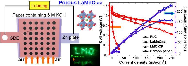 同时,所得LaMnO3+δ催化剂组装的Zn-空气电池的性能与使用商业Pt/C的性能十分接近,在200 mA/cm2的放电电流下的功率密度仅比商业Pt/C催化剂低2.1%。