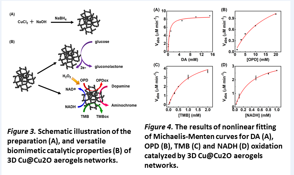 近日,该课题组提出一种全新的合成思路,采用一步法用NaBH4将NaOH与CuCl2的混合物在室温下进行还原合成了由粒径约为40 nm左右的纳米粒子自组装而成的3D多孔Cu@Cu2O凝胶网络框架。该合成方法具有简单、快速、易操作、不需要加热以及价廉等优势。研究发现,该三维多孔材料具有辣根过氧化物酶和NADH过氧化物酶的仿生催化性能,可以实现对TMB、OPD、dopamine和NADH的仿生催化。该3D多孔Cu@Cu2O凝胶为构建仿生催化传感界面的构筑提供了新的平台。该成果于4月6日发表在化学类国际顶级刊物 《德国应用化学》 (Angew. Chem. Int. Ed., doi.org/10.1002/anie.201801369)上。论文的第一作者为课题组新进教师凌平华博士,通讯作者为高峰教授。