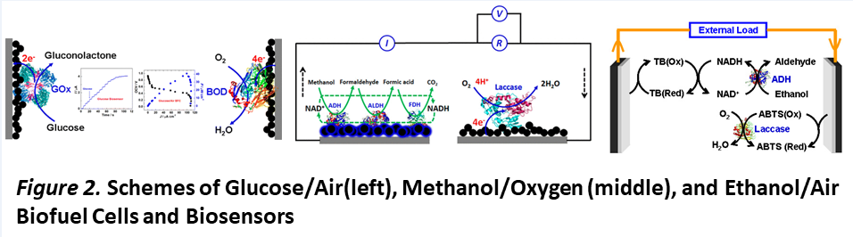 藉生物电催化原理,设计构筑了基于碳纳米点等微纳碳基材料的酶催化界面,构建了系列生物电化学器件,如直接电子转移型葡萄糖传感与葡萄糖/空气生物燃料电池(Anal. Chem., 2015, 87,2615–2622)、基于多种脱氢酶串联催化界面的甲醇传感与甲醇/氧气生物燃料电池(ACS Appl. Mater. Interfaces, 2017, 9 , 40978–40986)以及基于电子媒介型乙醇传感与乙醇/空气生物燃料电池(J. Electrochem. Soc. 2017 164, G82-G86)