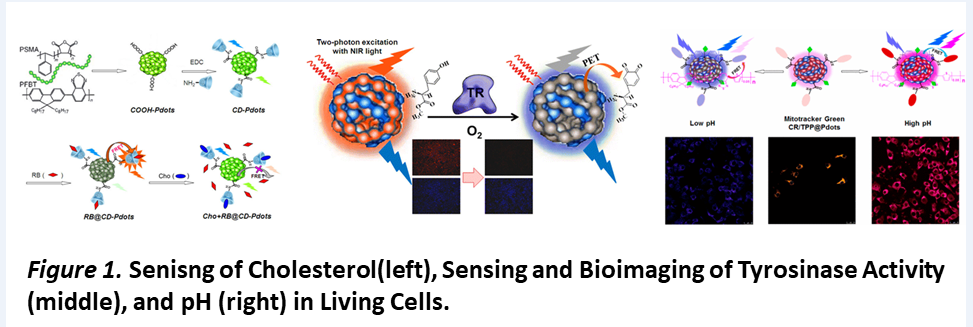 藉光化学与光物理机制,设计构筑了系列基于半导体聚合物量子点的传感界面,实现了不同的生化物质,如胆固醇(Langmuir, 2016, 32, 12725-12731)、酪氨酸酶(Anal. Chem., 2016, 88,7372–7377)以及H+(Anal. Chem., 2017, 89,11703–11710)的传感与细胞成像分析。