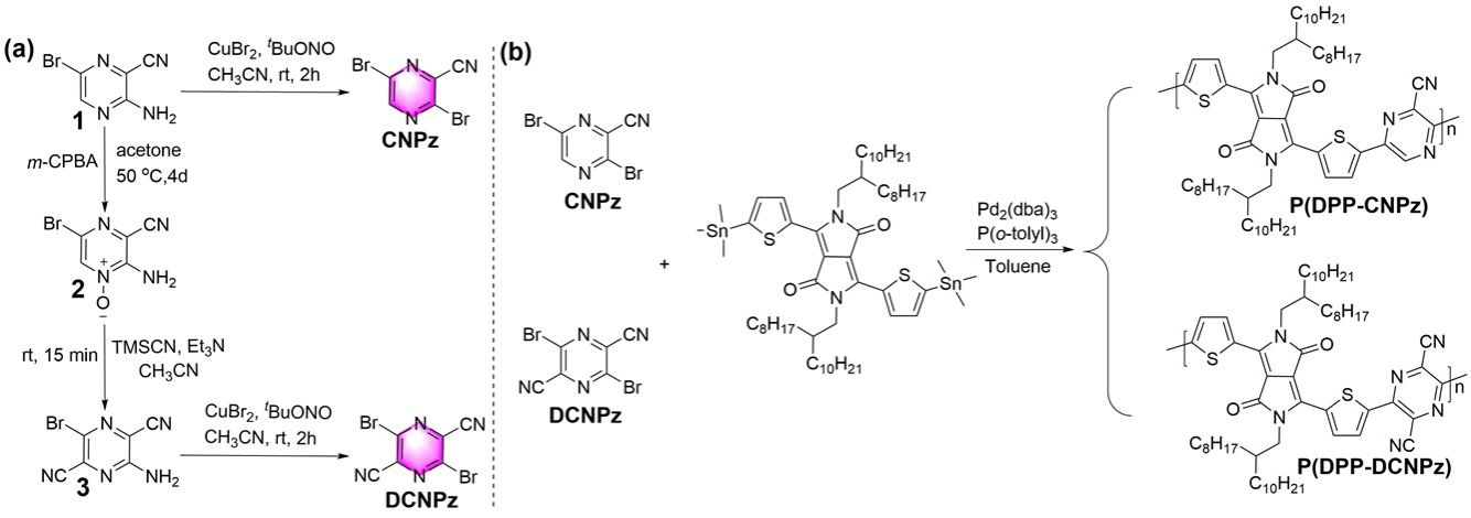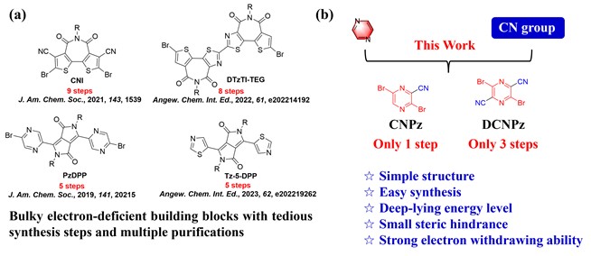 史永强课题组采取以吡嗪环为主体,引入氰基取代基的策略,设计并合成出两个结构简单的缺电子构建单元CNPz和DCNPz。并在其基础上合成了两种受体-受体型聚合物P(DPP-CNPz)和P(DPP-DCNPz)。单体CNPz和DCNPz缺电子单元的合成只需要由廉价原料进行一步反应和三步反应得到,可以为下一步热电材料实际应用提供借鉴意义。