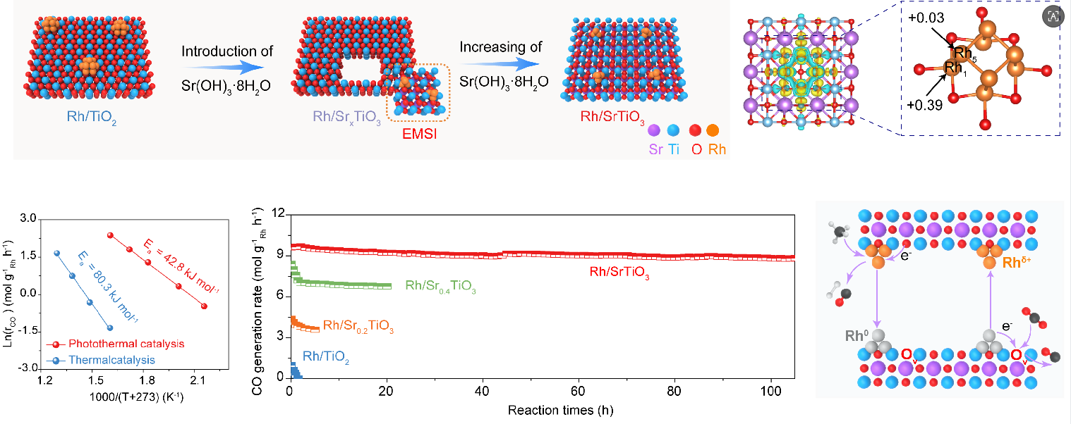 甲烷干重整(DRM)是一种能将两种主要温室气体——二氧化碳和甲烷——转化为有用合成气(一氧化碳和氢气)的关键反应。该过程不仅能减少温室气体,还能为化工生产提供原料,因此在碳中和背景下备受关注。然而,传统工艺需要超过800 ℃的高温,能耗巨大,且高温极易导致催化剂表面积碳和烧结,造成催化剂快速失效。近年来,科学家转向利用太阳能来驱动这一反应。这种“光热催化”过程,能够在相对温和的条件下实现合成气的可持续生产。该过程的核心在于催化剂的活性位点——金属原子的电子状态。研究发现,带正电的金属位点能更有效地活化甲烷分子,并引导反应走一条不易积碳的路径。但难题在于,在实际反应环境中,这类活性位点容易被还原失效,导致性能下降。