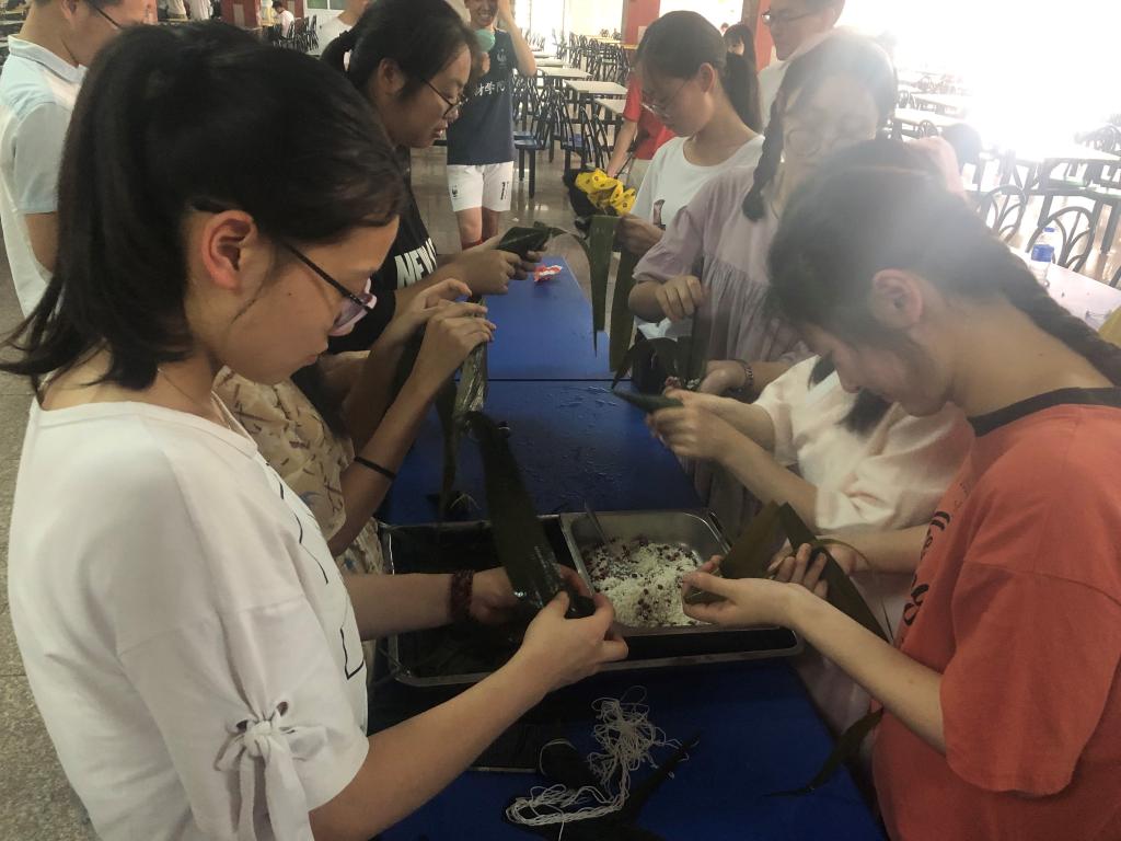 装完香包之后就开始包粽子了,虽然一开始大多数同学都不会包粽子,但大家都积极地参与,在食堂阿姨的悉心教学和同学们的自我探索下,每个人都包出了属于自己的的独特造型的粽子。可以说每位同学都发挥了自己的想象力和创造力,都感受到了自己动手制作的快乐。包好的粽子由食堂阿姨统一蒸煮,最后活动在浓浓粽香和同学们的欢声笑语中圆满结束。