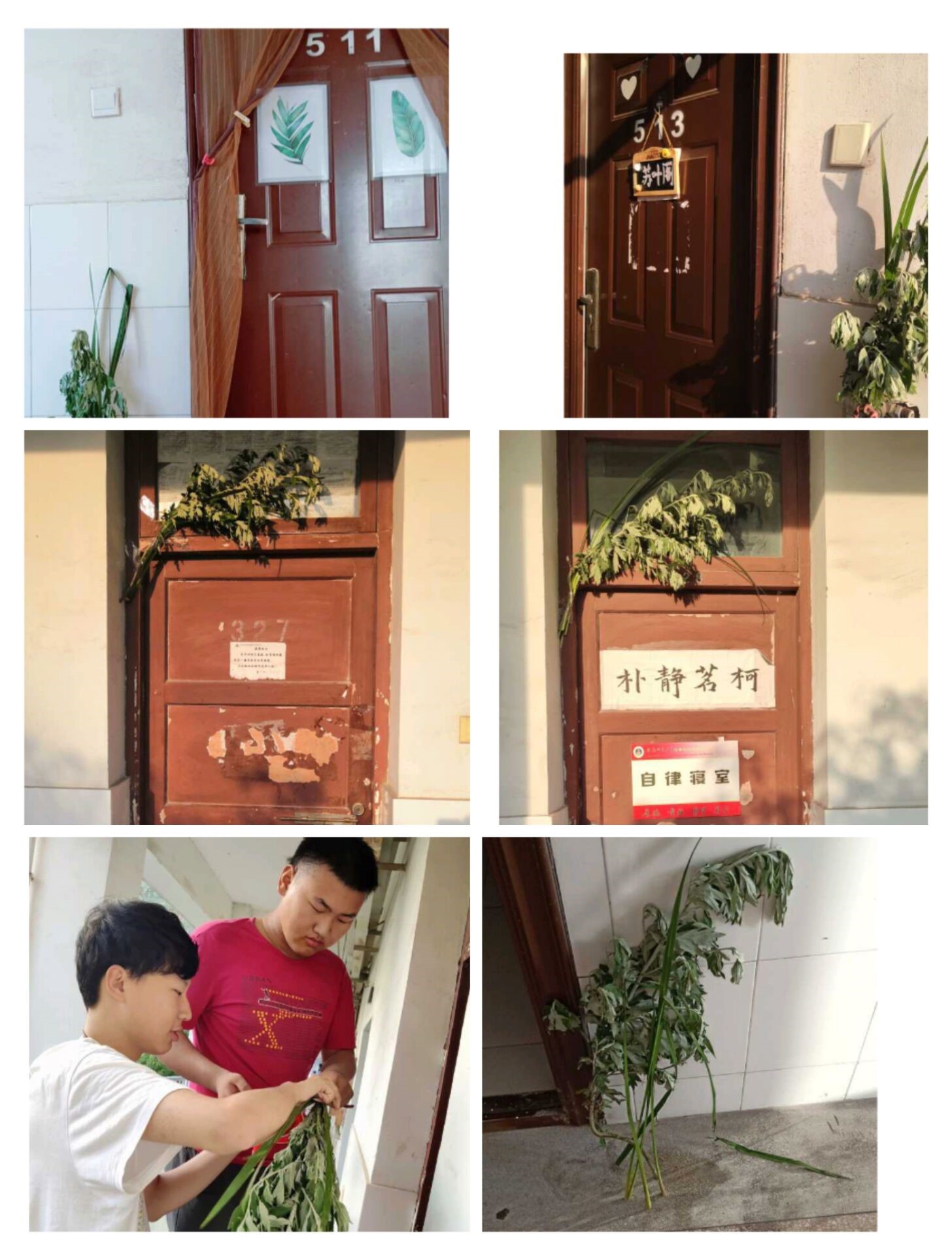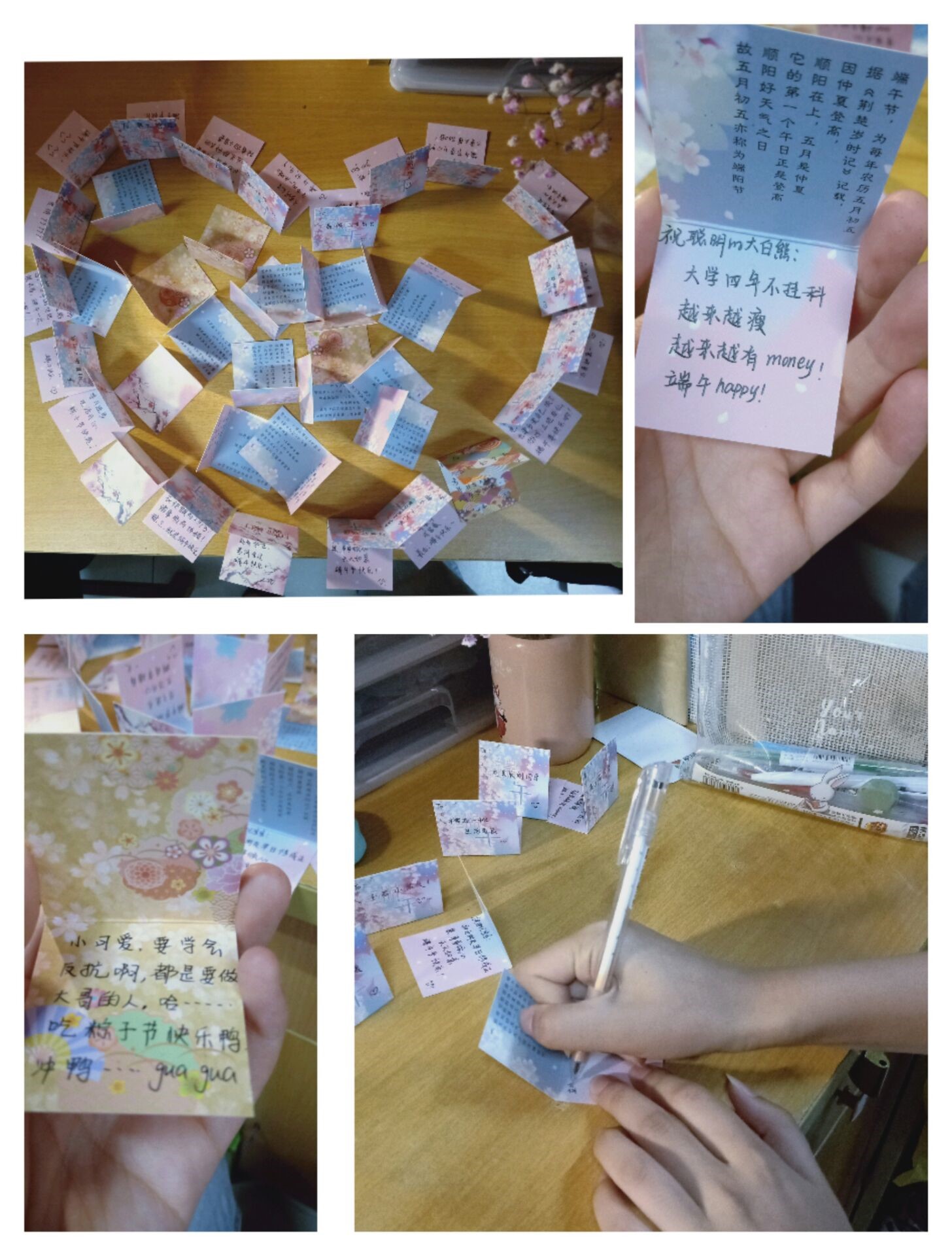 为保证活动有条不紊的进行,各班委分工合作。生活委员外出买艾草分发给各寝室长,各寝室长将艾草置于门前用于驱赶蚊虫。宣传委员负责拍照留存。副班长与组织委员负责香囊的环节,她们从网上购香囊,然后亲手包装,并在每一个礼盒中写上满满的祝福,希望这个与樱花们一起度过的端午能让他们体会到温暖。
