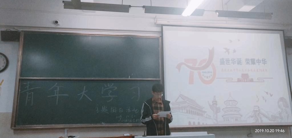 稍后进行的是各个团小组成员为此次活动准备的演讲,他们有的激昂有的沉着,但各自透露出的却都是对祖国慢慢的热诚与热爱。不论时代如何变迁,青年人都始终是建设祖国、建设新时代的生力军。青年人,尤其是青年大学生就应当怀揣这般热情。