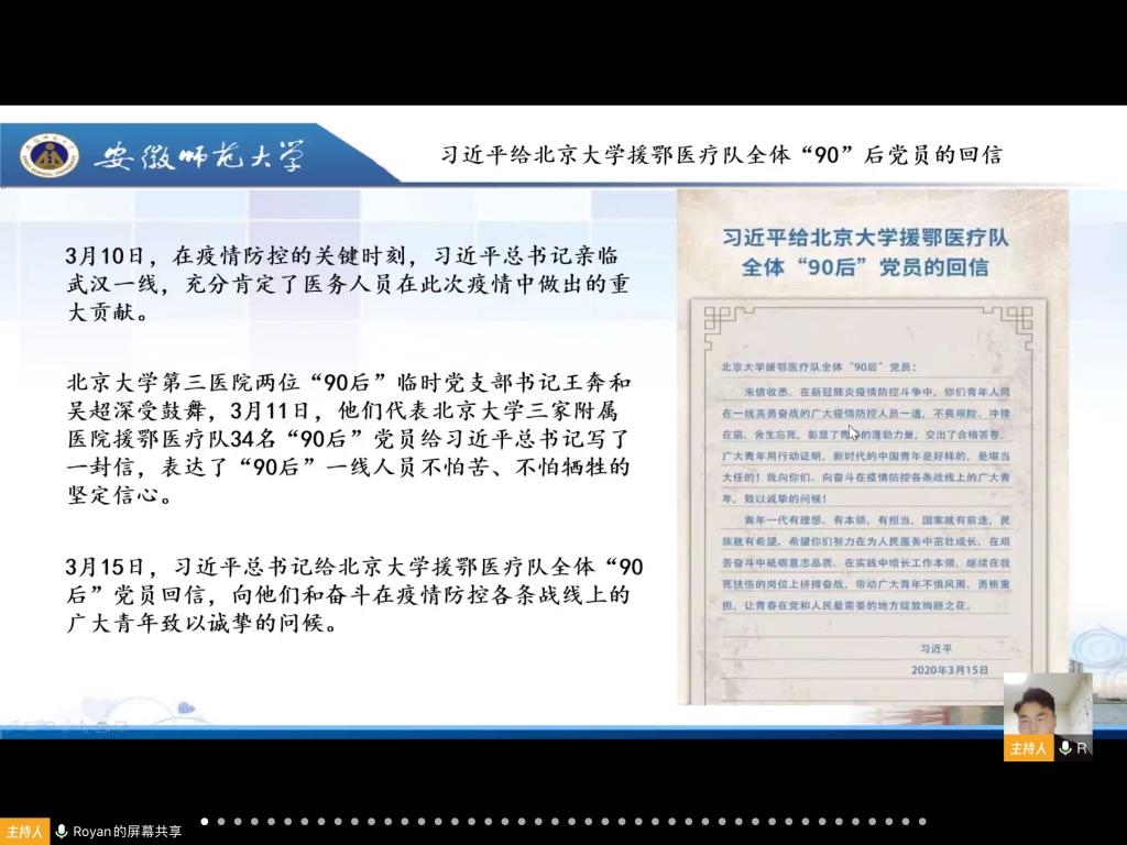 班会的第一部分,微团课:通过疫情我们看到了什么?在比线下班会更清楚的PPT上,我们看到了国家的强大、医务工作者的伟大、中国“基建狂魔”的速度等等。在凶猛的疫情中,我们国家的步步措施,已经将疫情控制,为世界做出了表率,这一切少不了一线“抗疫战士”的努力奋斗。此外,辅导员也带领全体同学学习了习近平总书记给北京大学援鄂医疗队全体“90后”党员的回信,在疫情防控的关键时刻,习近平总书记亲临武汉一线,充分肯定了医务人员在此次疫情中做出的重大贡献,此次回信不仅仅是给一线工作者的鼓励,也是激励我们积极为抗疫工作做出力所能及的贡献。
