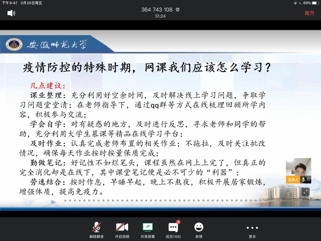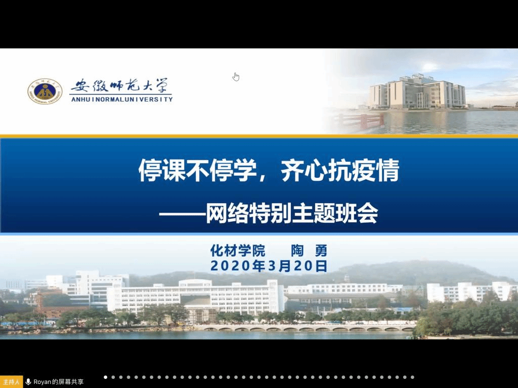 此次线上主题班会,给同学们带来的是清晰的信息,回答了同学们开学难、上课难的问题,为同学们的“新学期”解答疑难。相信在党和国家的真确领导下,疫情终能得到彻底控制,返校上课指日可待,同学们定能早日相聚在礼勤楼下,花津河畔。