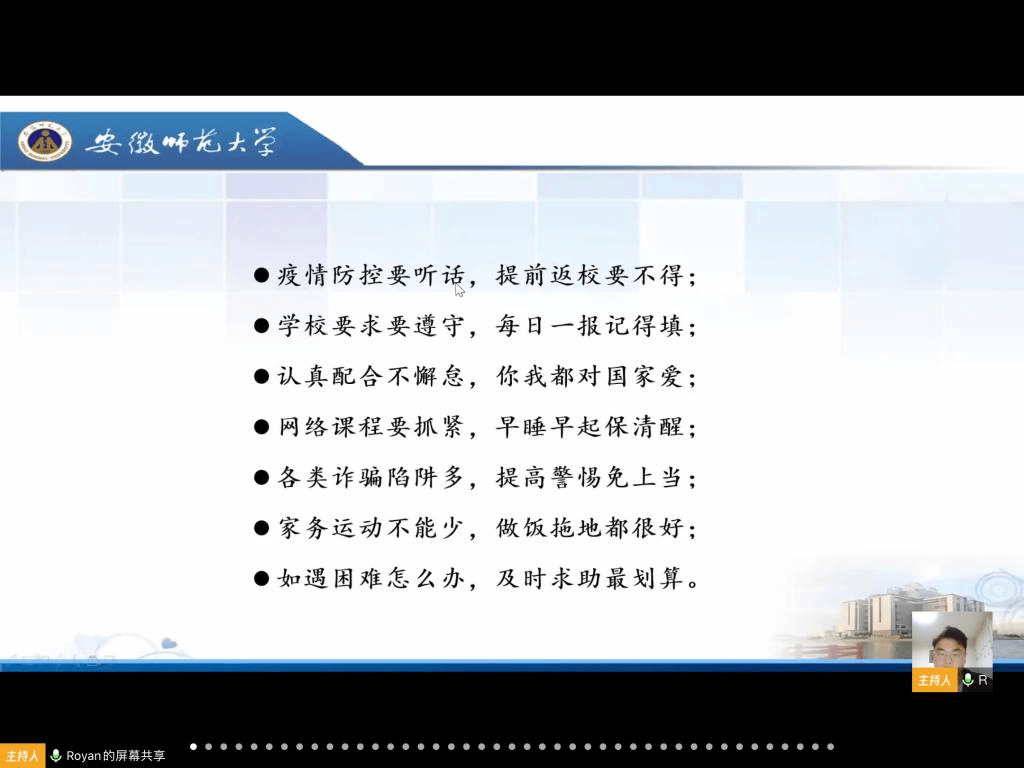 班会第三部分辅导员给同学们提出延学期间的要求:遵守学校安排,绝不提前返校;认真配合当地防控工作,及时完成每日一报;预防网络诈骗,提高警惕意识;网上课程不懈怠,学习适应新常态;增强防范意识,注意卫生,健康饮食作息,将抗疫进行到底。