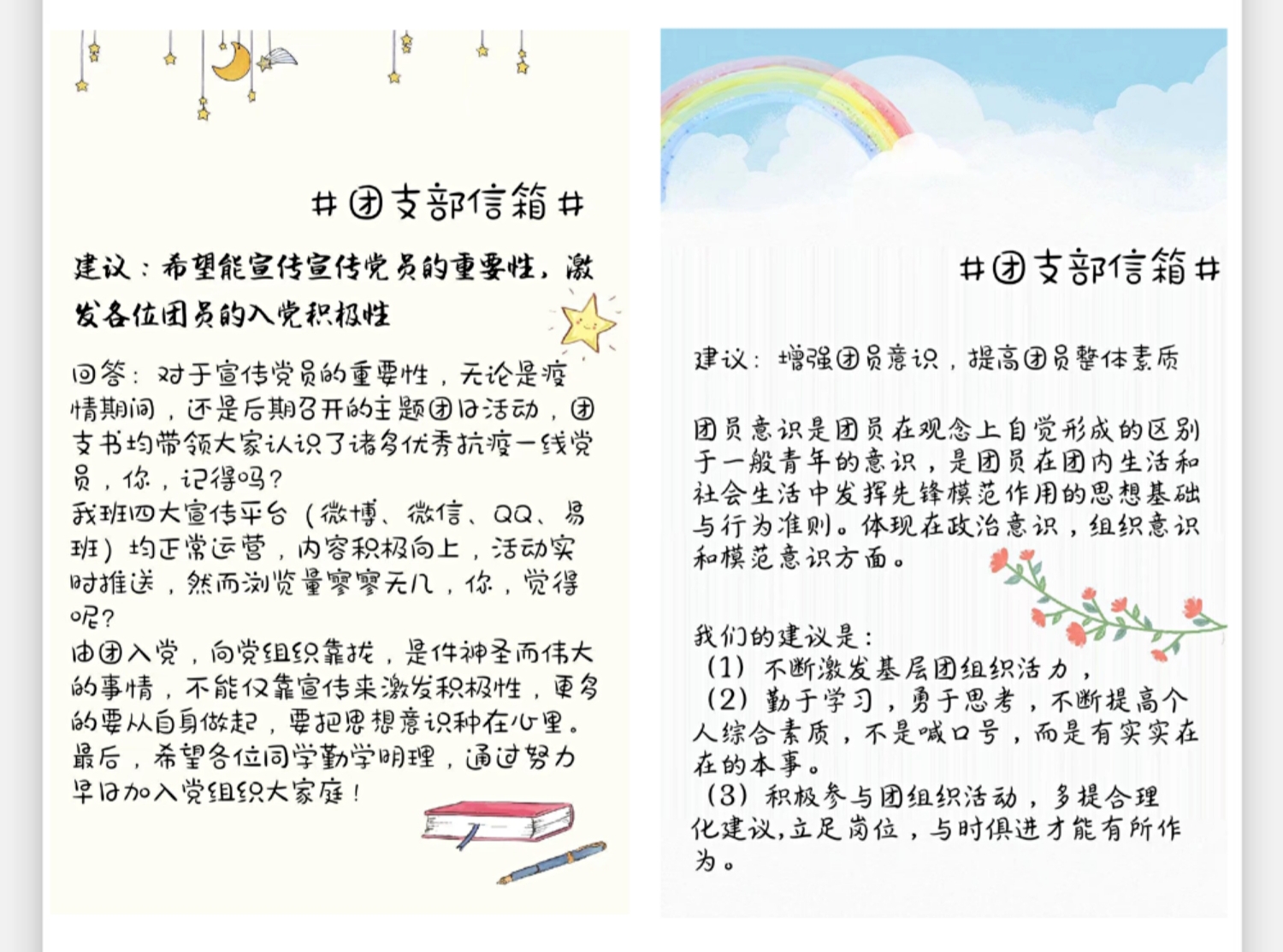 为了更好地服务同学,提升团支部工作质量,班级建立“团支部信箱”。团支部结合团员民主评议,组织各团小组收集团员对于团支部建设及班级建设的意见。支委会认真研讨同学们的建议,提出完善措施,将经过商讨后的意见反馈投入信箱,并借助班级qq进行发布。在未来的学习生活中,也欢迎大家提意见、说建议,支委会均将给予回应。