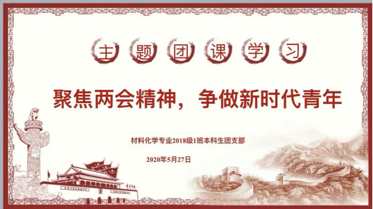 本网讯(18材料化学陈凯凯) 2020年5月27日晚上2018级材料化学1班在腾讯会议上召开了两会团课学习讨论会,借用网络会议的形式,一起学习了今年两会的相关知识。