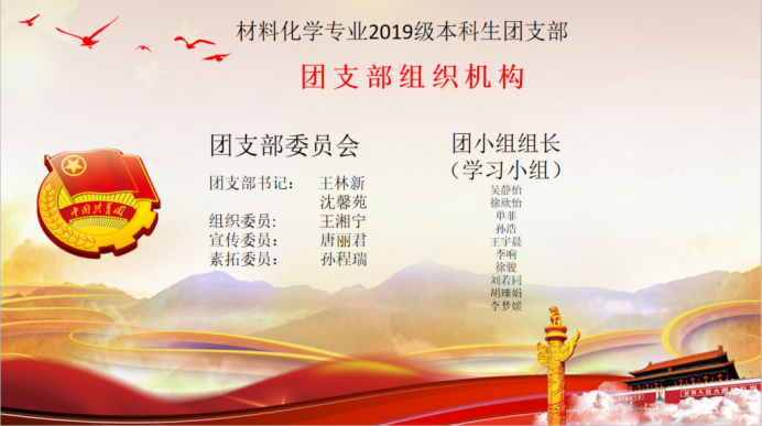 由于新学期班级内部调整,19级材料化学专业合并原先的两个团支部,成立材料化学专业2019级本科生团支部,在经过竞选之后,成立新的团支部委员会,相关名单已于大会上公布。