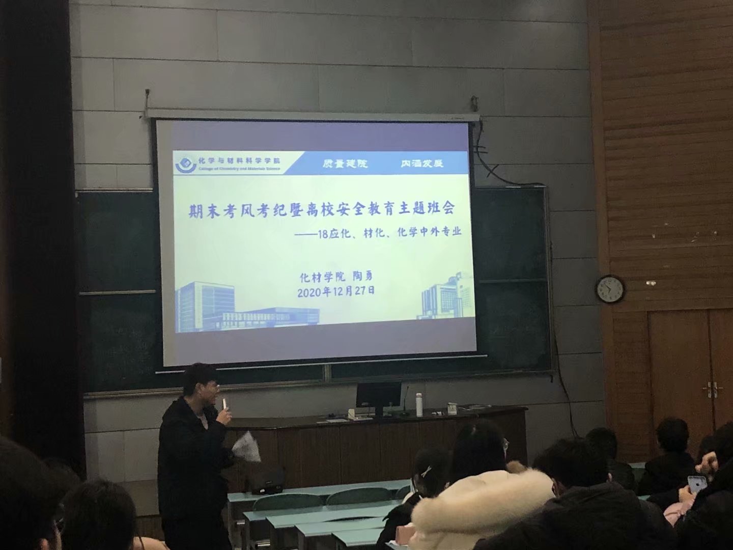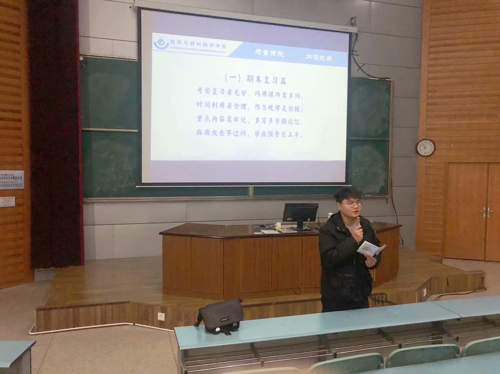 )为进一步督促学生树立良好的学风和考风,做好学生的文明离校和寒假安全教育工作,2018级应用化学、材料化学、化学中外专业于12月29日开展期末考风考纪暨安全离校主题班会,本次班会由辅导员陶勇主持。