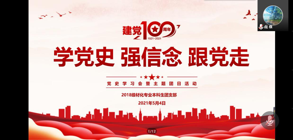 本网讯(18级材料化学 谢涛)5月4日晚,2018级材料化学专业1班、2班团支部于线上召开“学党史、强信念、跟党走”党史学习教育暨主题团日活动。本次会议由1班团支书黄宁宁主持召开,院团委书记陶勇,2018级材料化学专业全体同学共同参与。