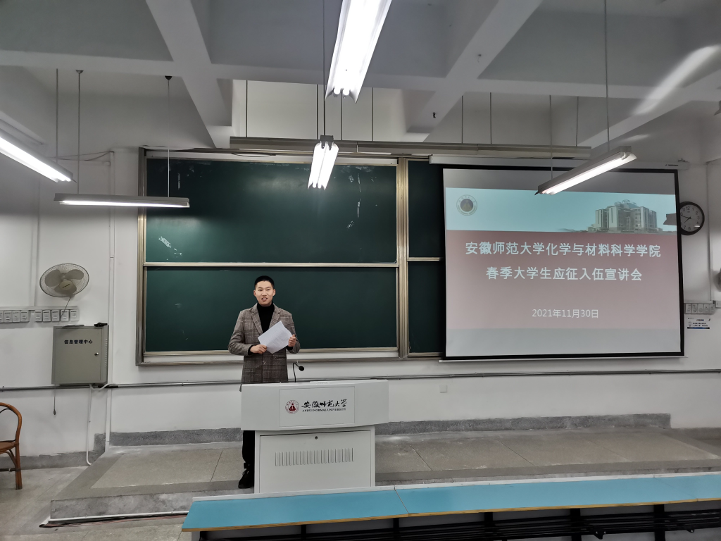 宣讲会上,2018级化学(师范)专业贾治林同学作为退伍复学同学代表发言,贾治林同学以自己的亲身经历向同学们介绍了自己入伍以后的感受。贾治林同学说到“党和国家为我们创造了今天美好的生活,我们需要用自己的力量为祖国明天的发展和安全作出自己的努力,积极参军,保家卫国,是我们应尽的责任和义务。”贾治林同学言辞诚恳,感情激昂,能够感受到贾治林同学深厚的爱国情怀,各位同学的积极性也被充分调动。