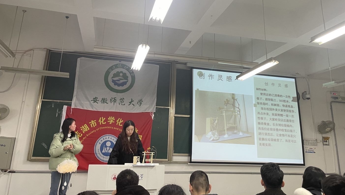 十组选手依次上台展示参赛作品,利用PPT、视频等媒介对作品进行阐释说明,其中包括制作过程、作品实用性与意义等。每一组改造的物品都别具一格,使人眼前一亮。“共用电子队”的同学使用消毒后的一次性筷子、树枝、秋日落叶、专业实验中剩余的粘土制作形成寓意深刻的“枯木逢春”,在保留旧物原有的特征外赋予其二次新生。汇报过程中,与会嘉宾对作品进行了点评,并进行了中场知识问答,互动墙抽奖等活动。