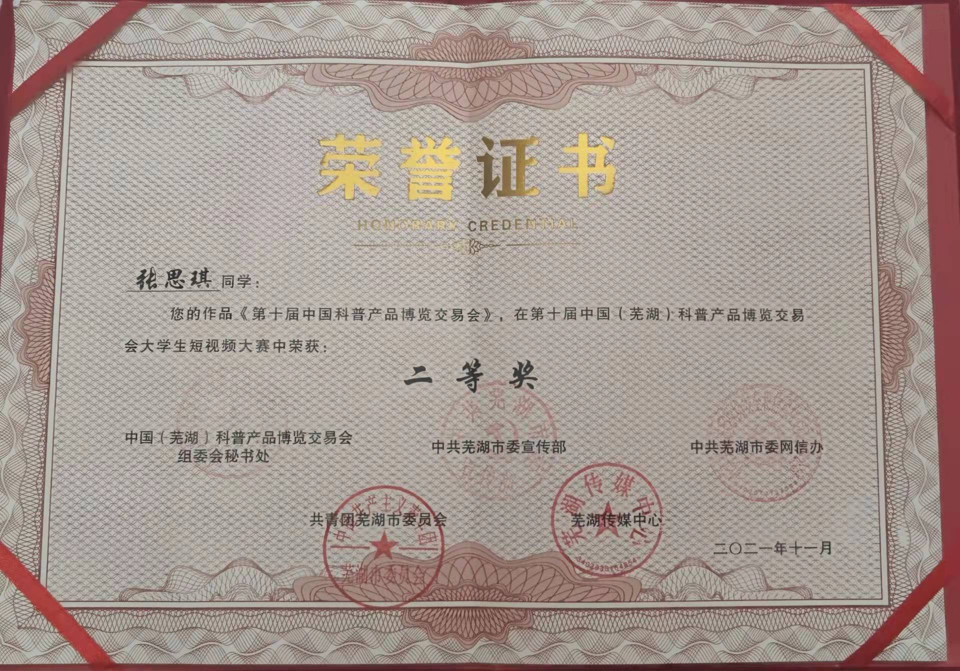 张薇)为丰富校园文化生活,提高科学文化素质,培养大学生的实践能力和创新精神,学院积极组织本科生参观第十届中国(芜湖)科博会并参加大学生短视频大赛,经赛会组委会评审,共获大赛一等奖1项,二等奖1项,三等奖1项。