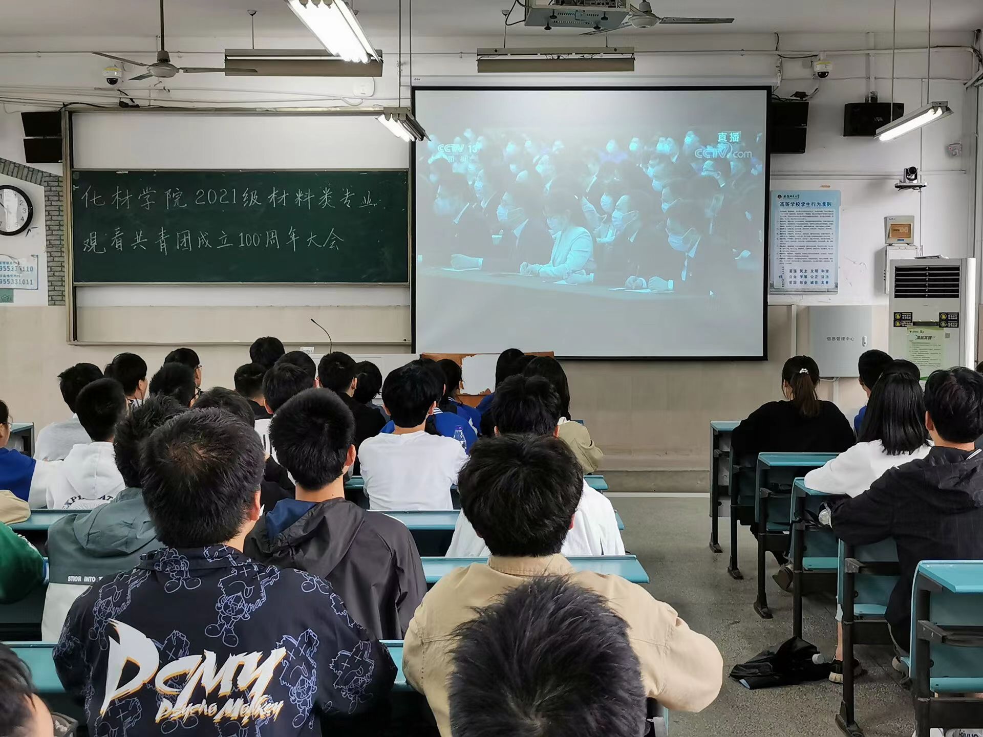 余子妍)2022年5月10日,庆祝中国共产主义青年团成立100周年大会在北京人民大会堂隆重举行,为深入学习习近平总书记重要讲话精神,2021级材料类专业学生在教室内通过网络集中观看直播,认真聆听总书记重要讲话,共同庆祝中国共产主义青年团成立100周年。