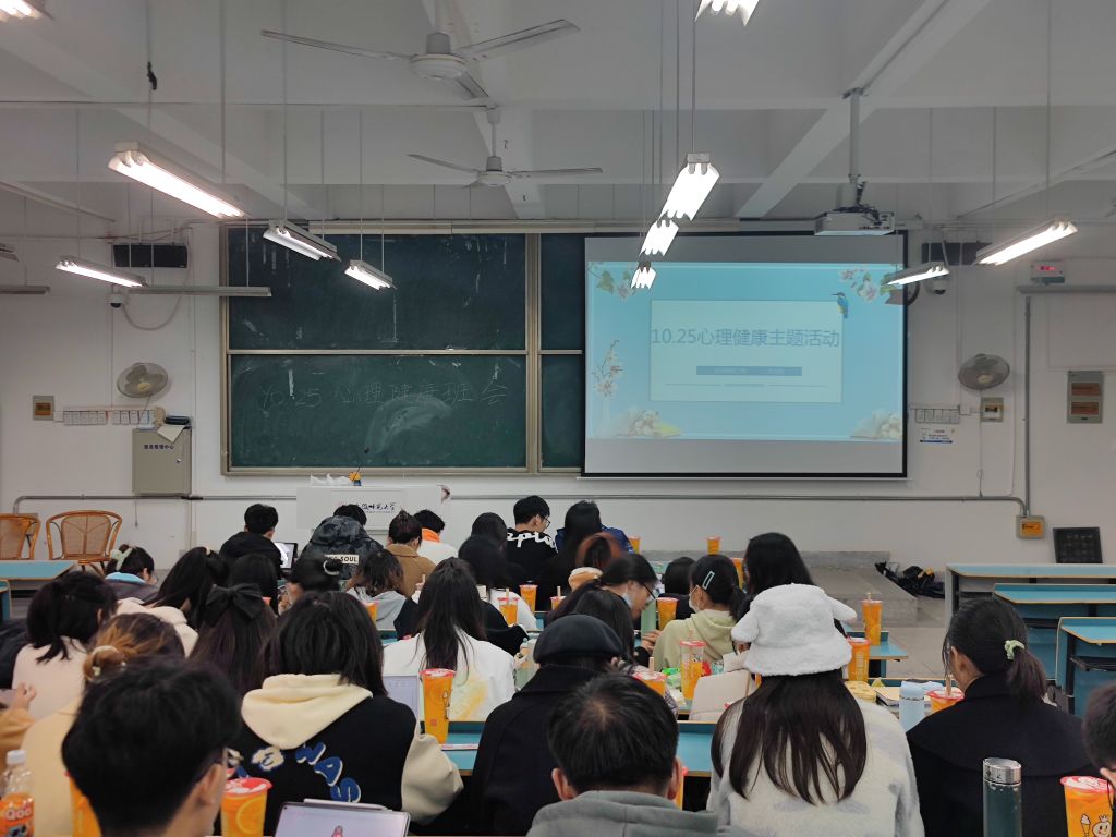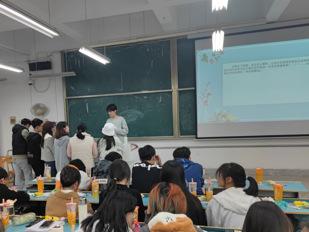 在心健委员万文钧的主持下,首先他分享了趣事来激发大家的兴致,而后分析了当代大学生心理健康现状,引起大家一致共鸣。随后通过汉字组合、含水传字以及情景想象等游戏,帮助同学们在做游戏的过程中释放平日学习的压力、放松心情、收获了快乐,心理主题班会也达到了其该有的目的。