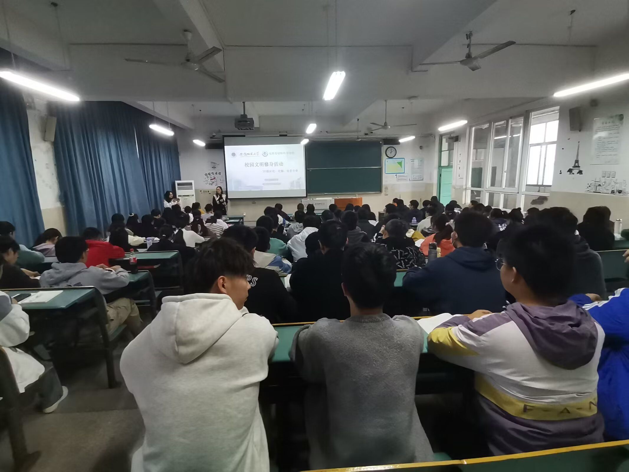 共建文明教室,走近思政课堂。在会议伊始,辅导员王芳老师要求大学生要做到自觉维护环境卫生,不遗留个人垃圾;自觉爱护公共物品,不乱涂乱画乱贴;自觉节约各类资源,主动关灯关风扇;自觉遵守文明礼仪,不穿拖鞋背心入内;自觉保持教室安静,不在教室喧哗嬉戏;自觉做到礼让共享,不抢座占座;自觉感恩教师,不轻视无礼,主动为老师准备好多媒体设施。弘扬新时代大学生谦逊礼貌的风尚,利用课堂激发学生的真善美,塑造高雅气质,营造内外兼修、知行合一的氛围,彰显思政课的价值引领作用。