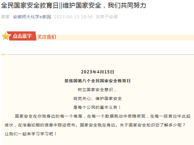 学院还依托微信公众号推出《全民国家安全教育日》网文,积极转发全体同学要共同努力,维护国家安全。