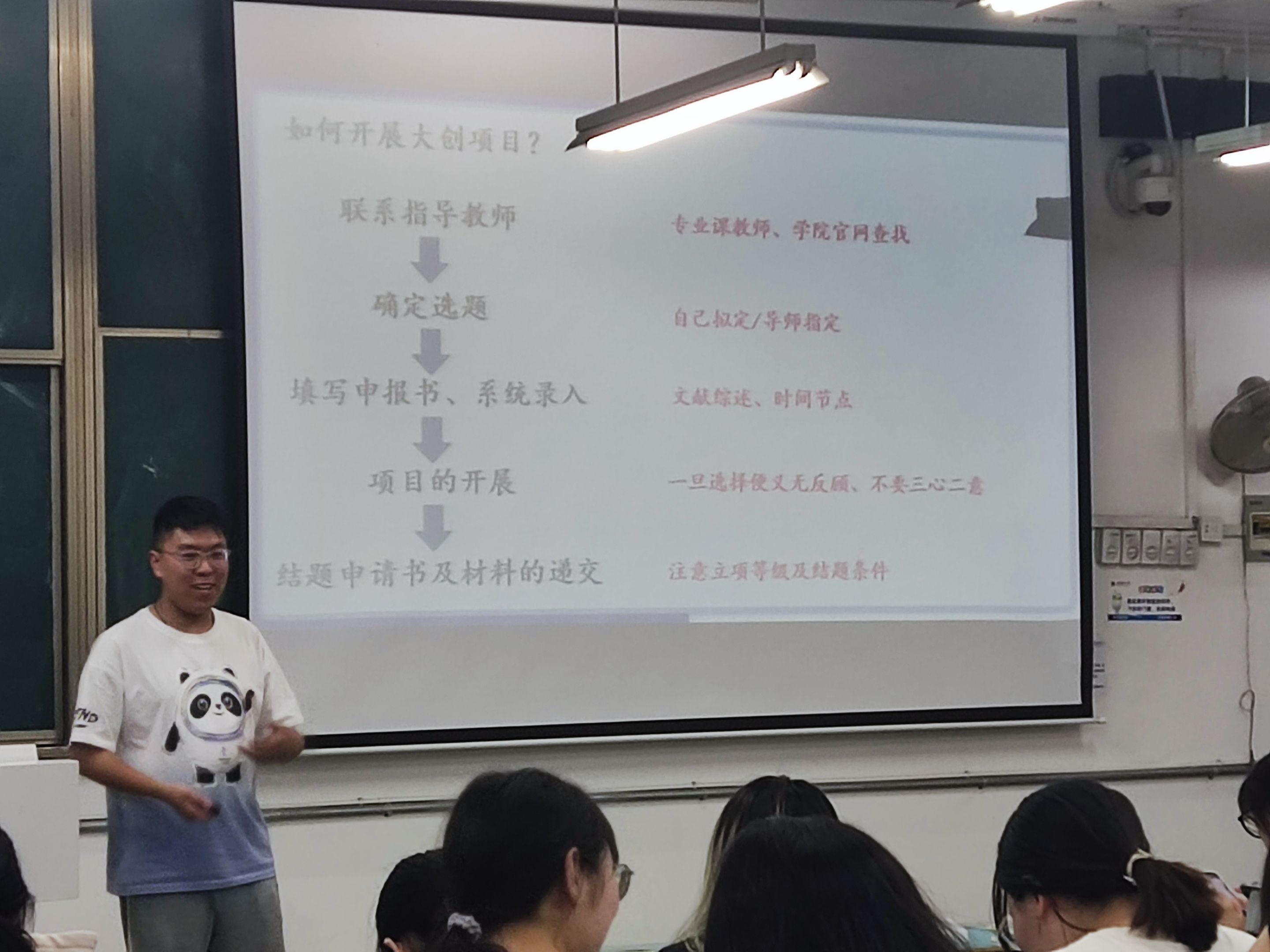 四班班长赵振翔同学向全体同学介绍了两位学长、学姐的基本情况。贾金名结合自身开展大创的情况,先向大家说明了该如何选择导师和开题以及组队的两种方式,并就大创完成的两项难点——申报书和结项材料撰写进行更加详细的说明。对于申报书撰写,她建议同学们要以高度的责任心和充足的耐心去打磨材料,以尽可能高的标准去完成材料撰写和申报工作。在申报过程中,遇到难点时要积极寻求指导老师帮助,充分发挥指导老师和团队协作的力量。对于结项方面,她介绍道根据校级、省级和国家级这三个不同等级的项目,对应结项的要求也存在较大差异,因此她提醒同学们要注意量力而行,结合自身和团队实际情况做好选择,切忌好高骛远,只有具备对科研训练的的热爱最终才能收获硕果。
