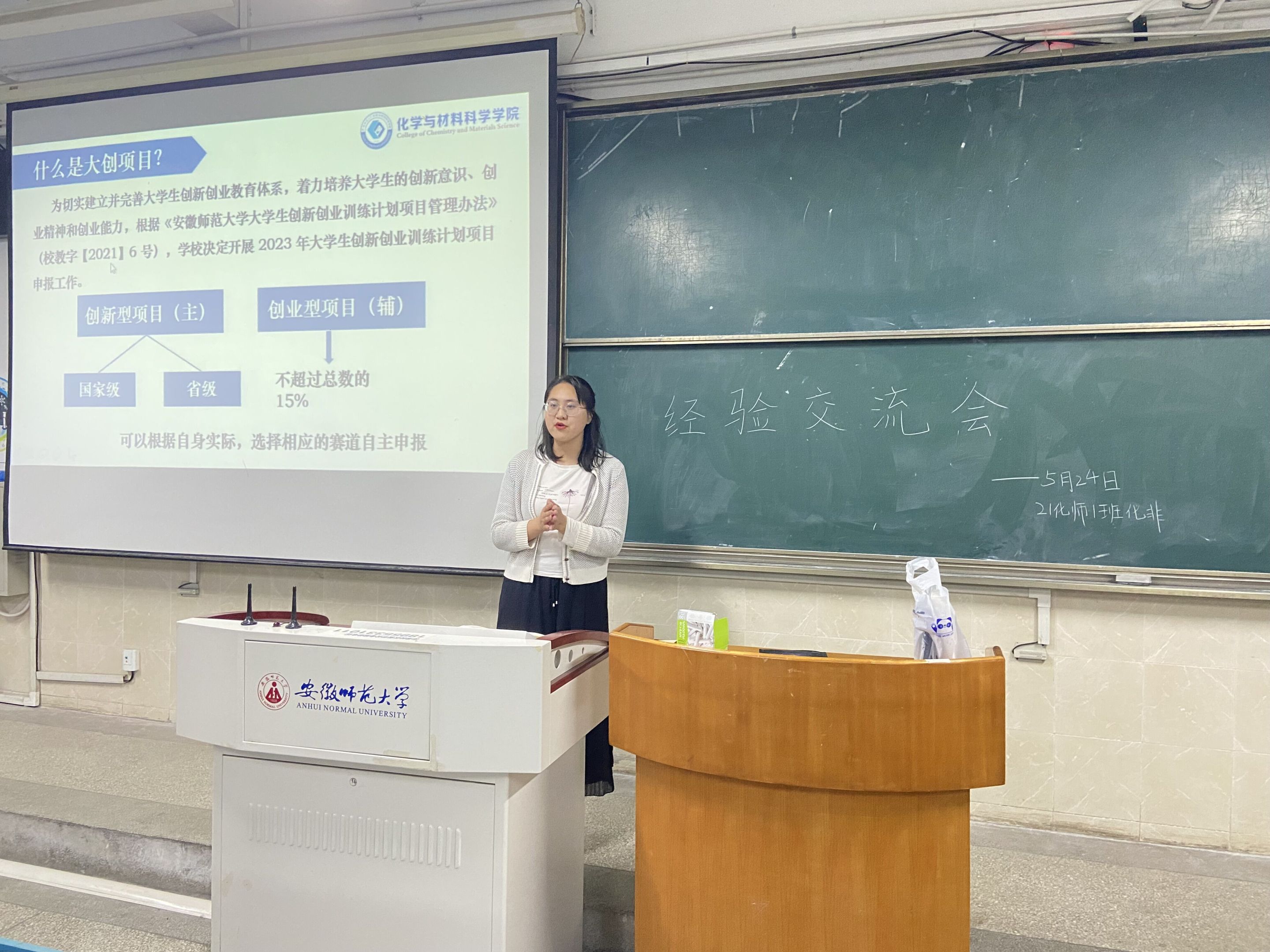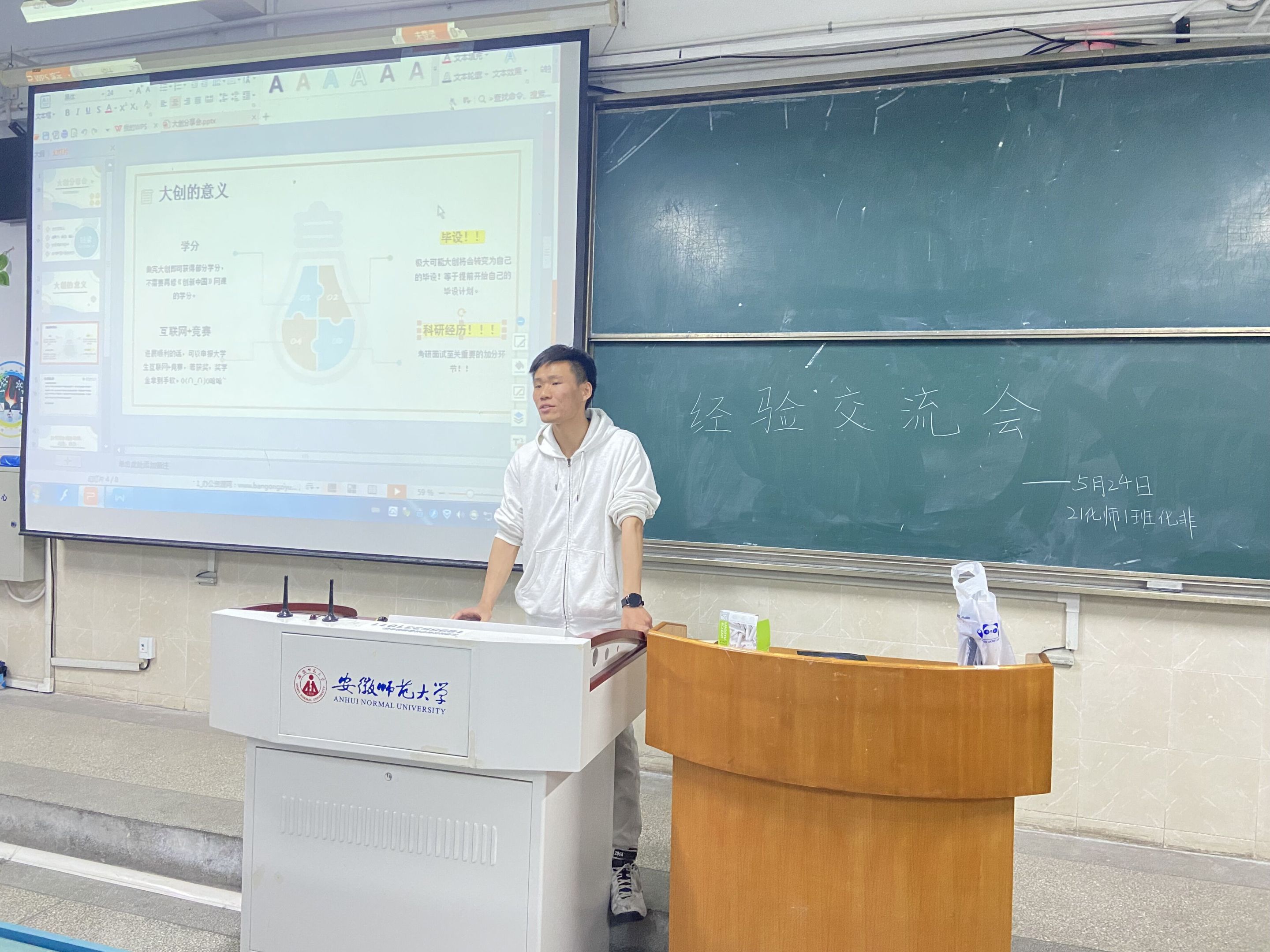 学生对大创的积极性,帮助同学们深入了解大创申报,学习大创开展相关事宜,5月24日晚,2021级化师1班和化非班在2010504教室开展大创经验交流分享会,本次会议邀请了2019级化学非师范王睿和应用化学专业吴泓婧作为分享人。