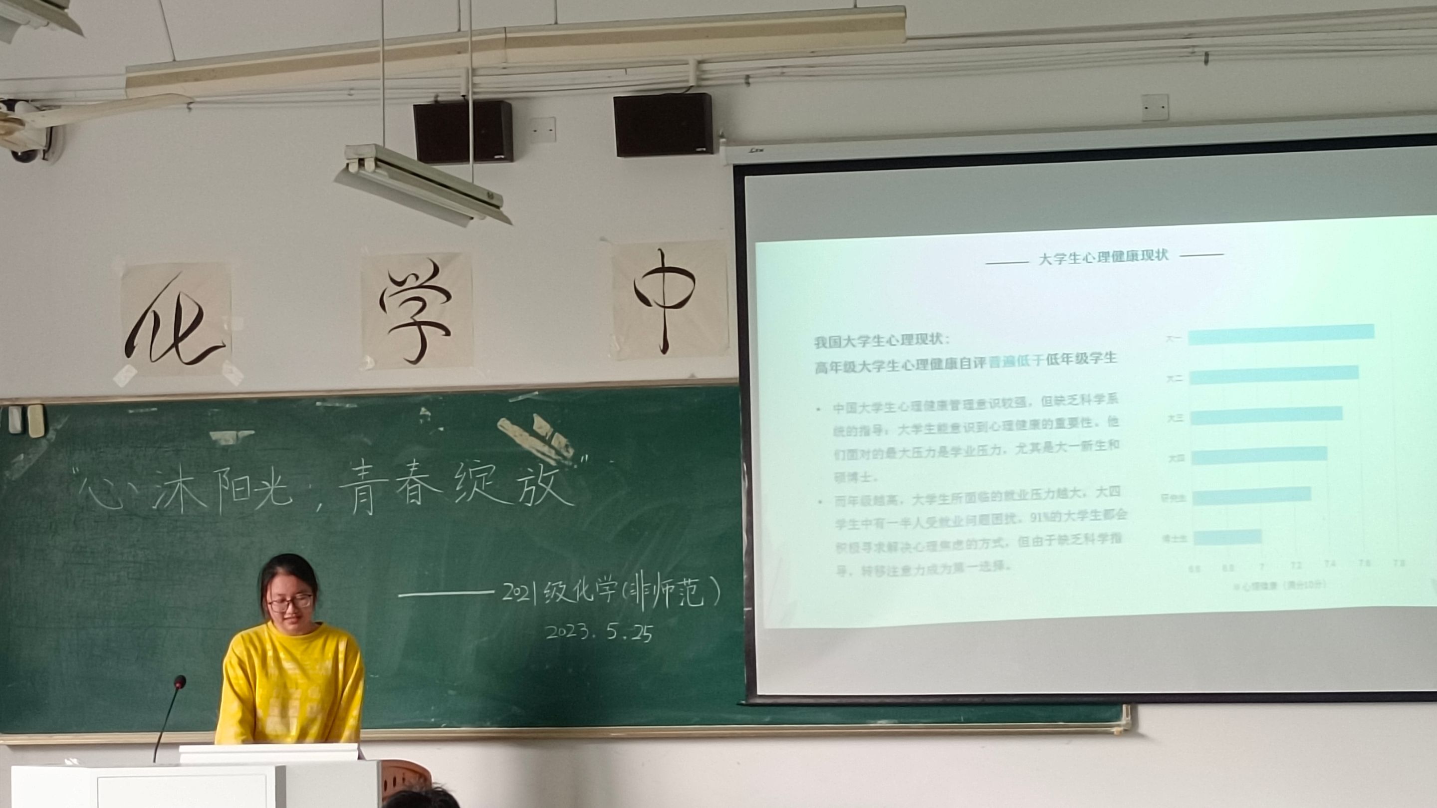盛莹、陶勇)为迎接“5•25”心理健康日,帮助化非班级同学们在繁忙的学业之余排解压力,营造大学生心理健康成长的良好氛围。5月25日下午4:00,2021级化非专业在2070207教室开展“心沐阳光,青春绽放”心理健康教育主题班会。本次会议由心理委员王欣羽主持,化非全体同学参与。