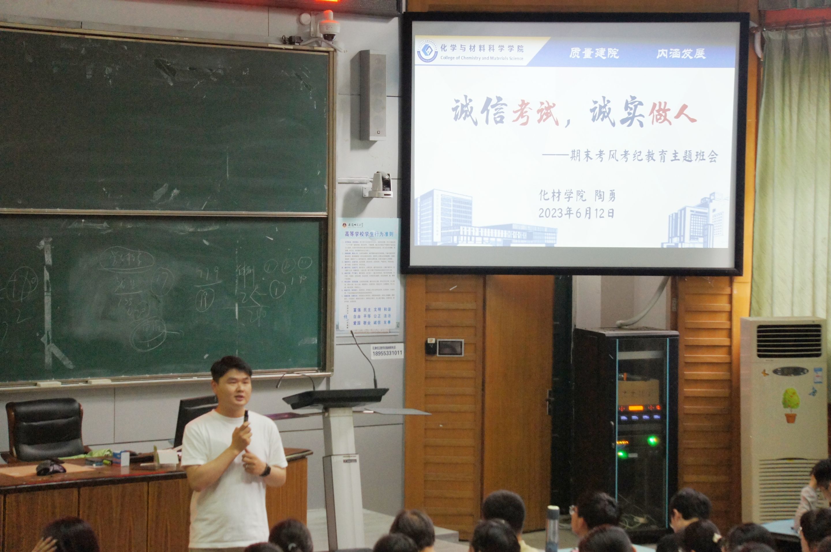 随后,为进一步加强期末班级学风建设和考风考纪教育,引导学生自觉遵守考试纪律,抵制作弊等不良风气,营造文明诚信的考试氛围,陶老师面向全体同学开展了期末考风考纪专题教育。他从考试的重要性、作弊的心理动机、考试作弊的愿意和后果等方面进行了重点强调,提醒所有同学要把好考试质量关,营造公平、公正的考试环境,引导学生明确考试的根本目的,做有德性、守契约、讲诚信的化材人。