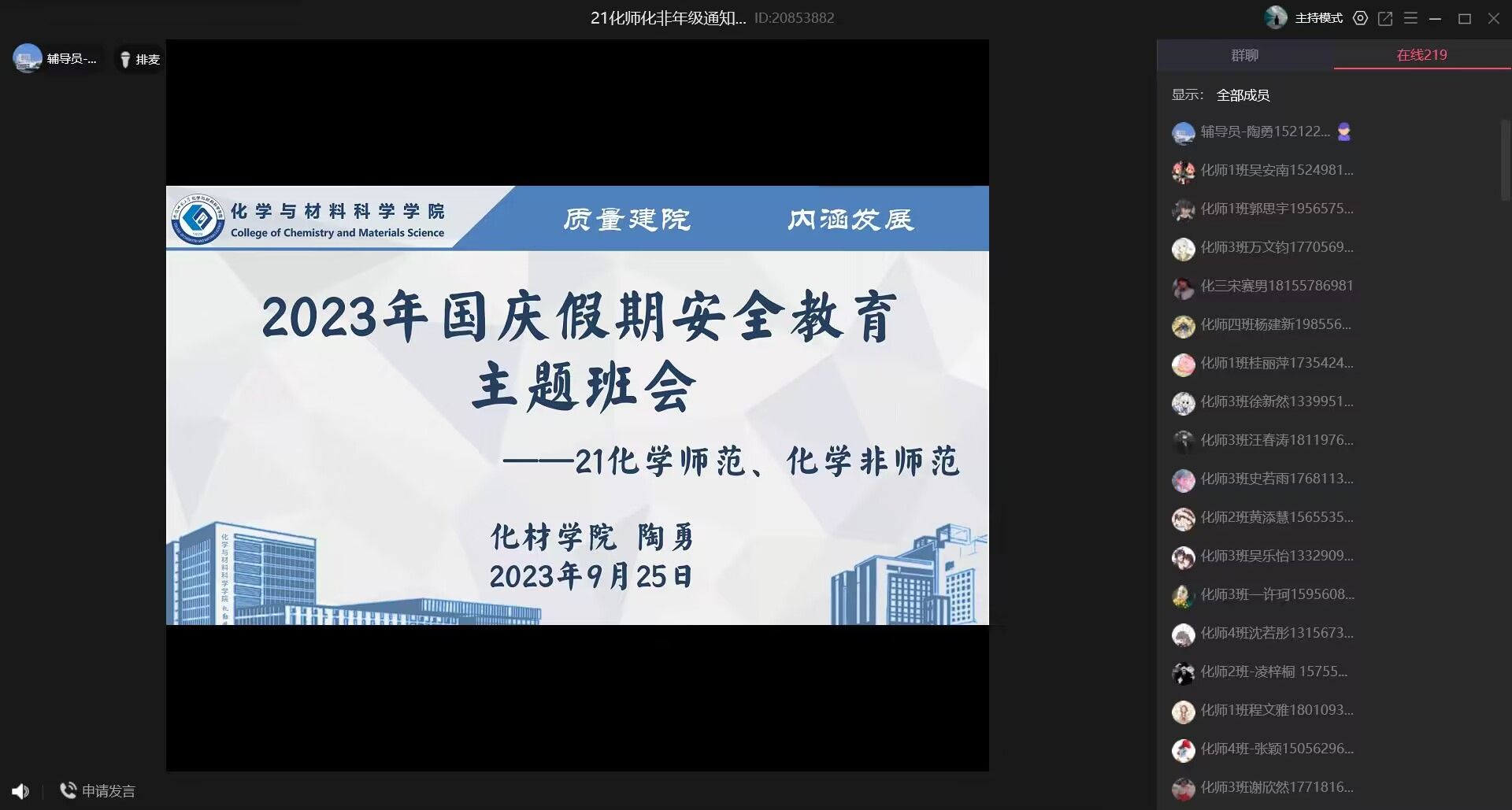 为做好中秋、国庆假期学生离校安全教育,增强学生安全意识与自我防范意识,确保学生度过一个安全、充实的假期,9月25日中午,辅导员陶勇在线上为2021级化学师范、化学非师范各班级召开了国庆安全离校主题班会,所有学生参加了此次班会。