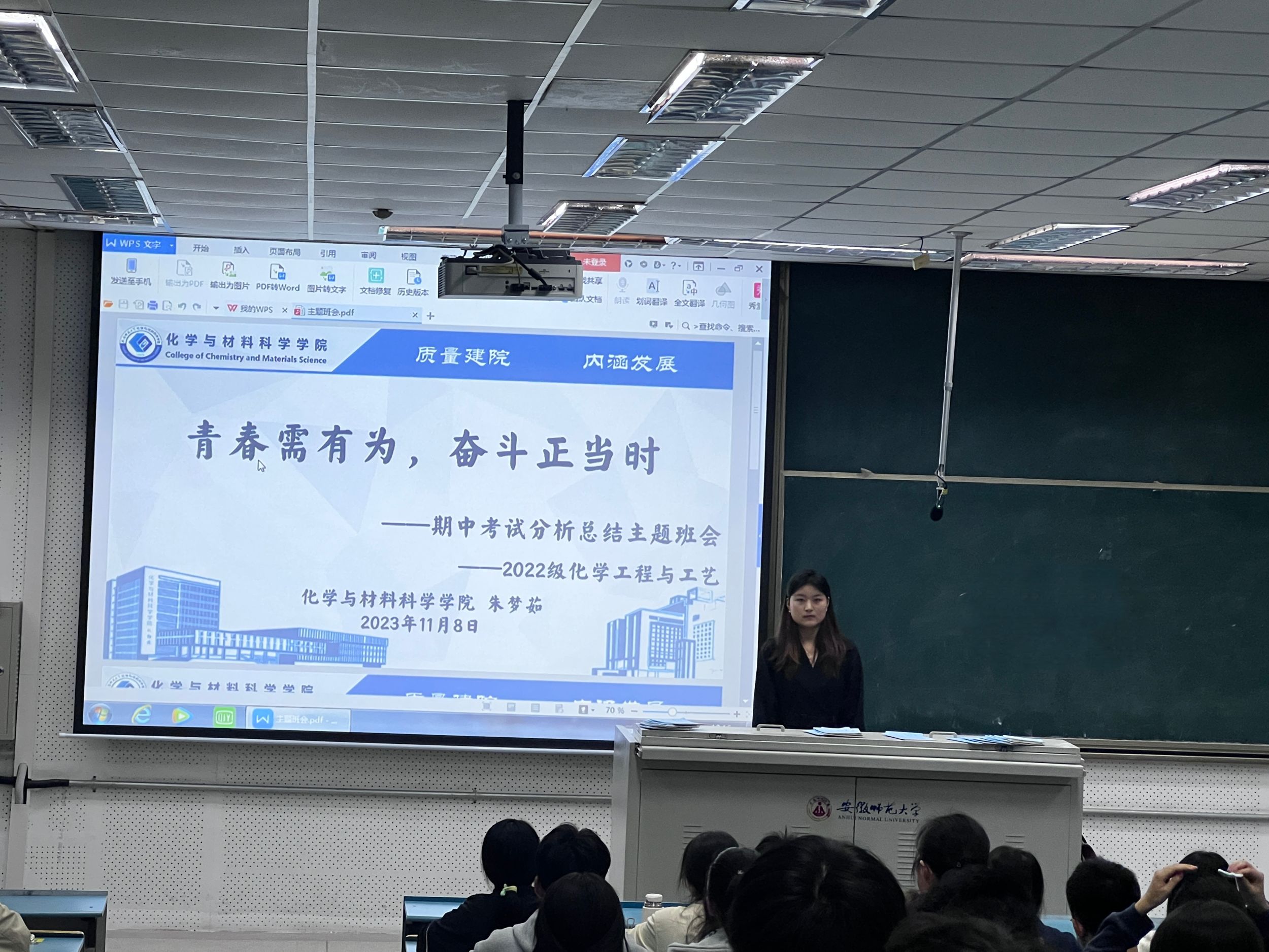 朱梦茹、郁妍)2022级化工专业期中考试结束之后,2023年11月13日晚,化学工程与工艺专业在7号楼401教室召开了期中考试总结班会,会议的主题为“青春需有为,奋斗正当时”。本次班会由辅导员朱梦茹老师主持,主要面对化工两个班级的同学,针对本班成绩及学习状态等进行分析。
