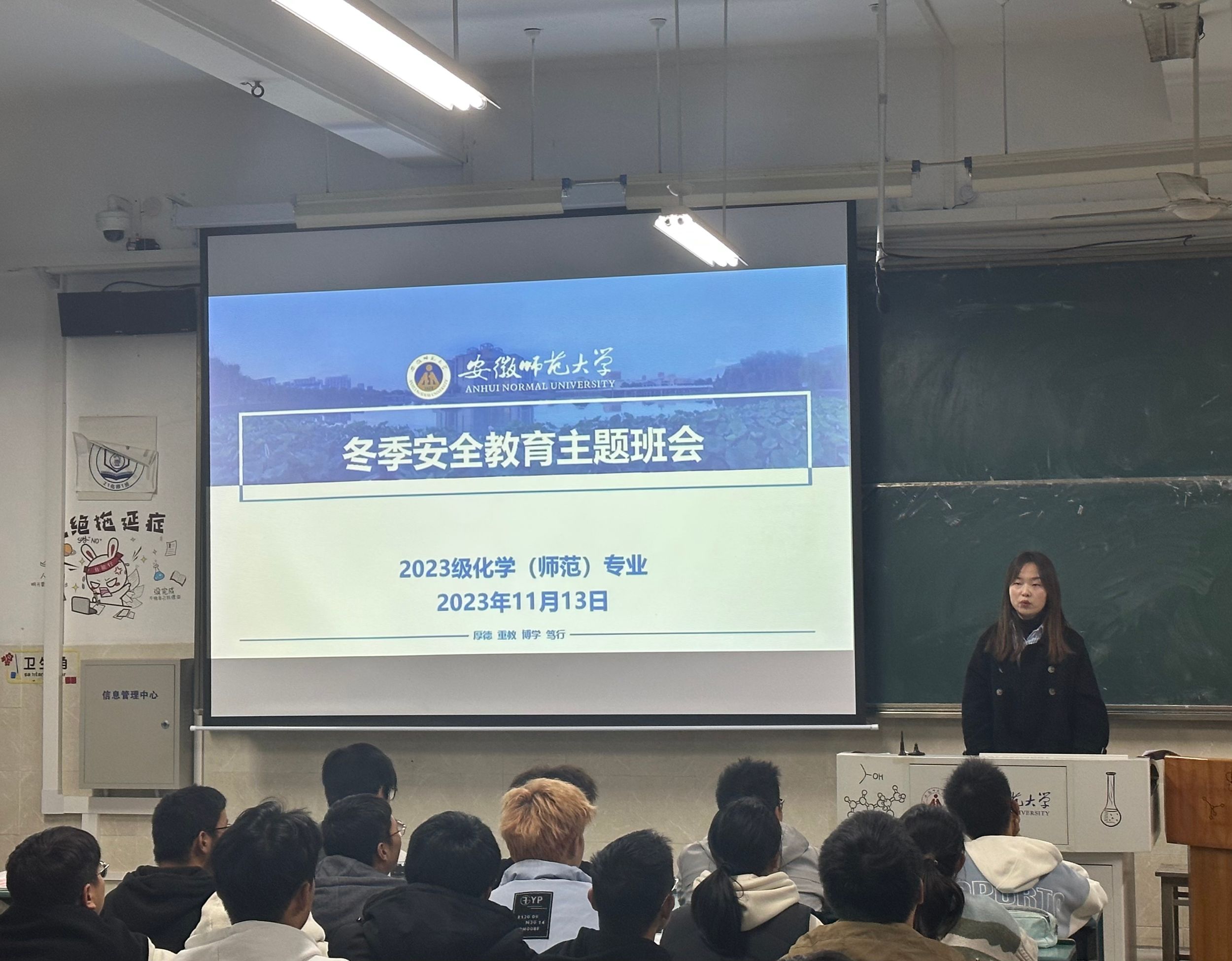 王涵 王霞)为进一步提高学生的安全意识和自我保护意识,切实做好冬季校园安全教育工作,11月13日下午,2023级化学(师范)专业在固定教室开展以冬季安全教育为主题的班会,本次班会由辅导员王霞主持。