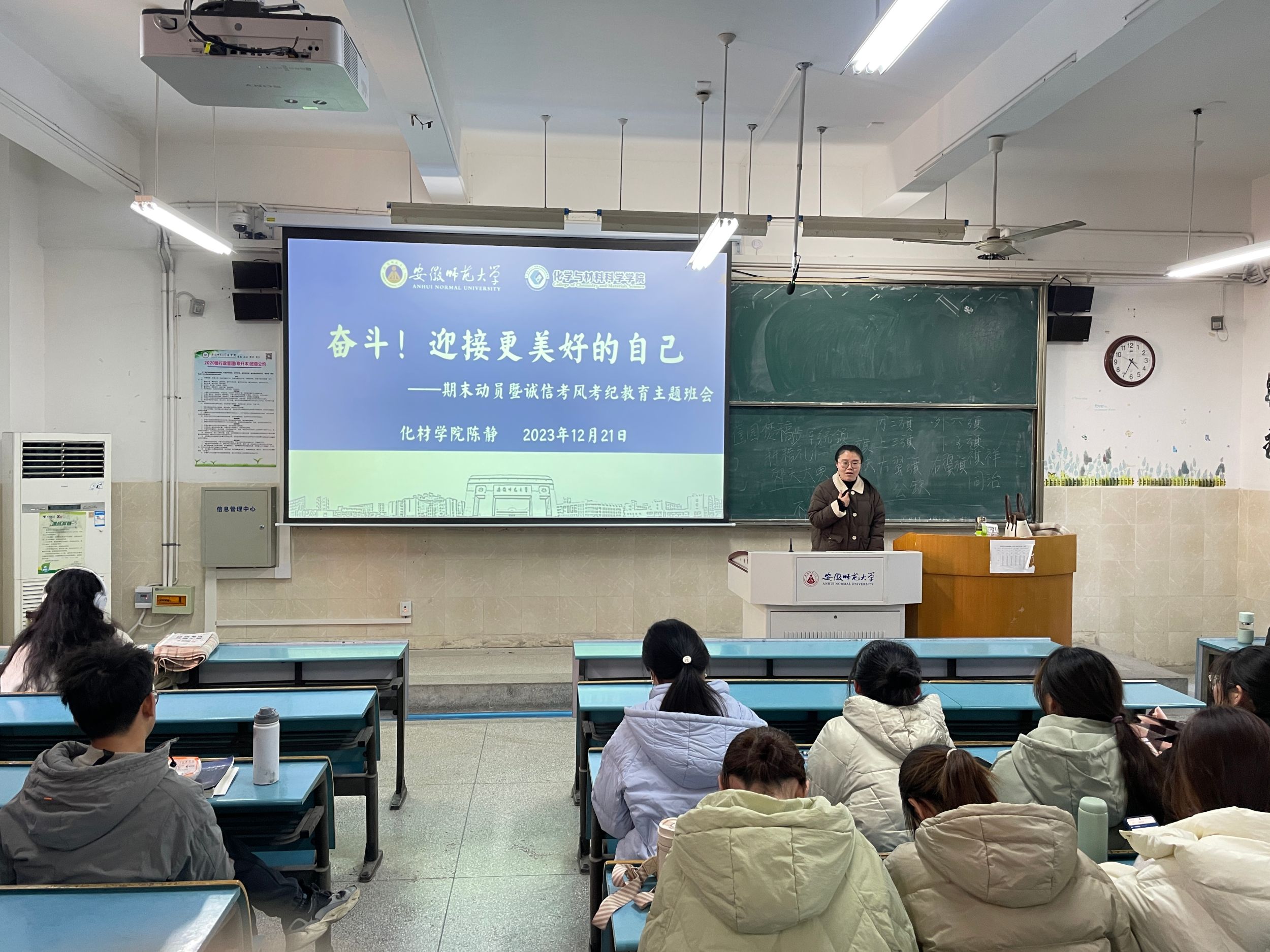 普通全日制本科生课程考核与成绩管理办法》(校教字〔2021〕9号)第三十条相关规定等,要求全体同学自觉遵守考试纪律,杜绝任何作弊行为,提醒考生们要自觉抵制各种形式的作弊行为,保持良好的考试风气。随后,陈静老师对近期班级工作进行梳理,对寒假离校工作做了相关提醒。