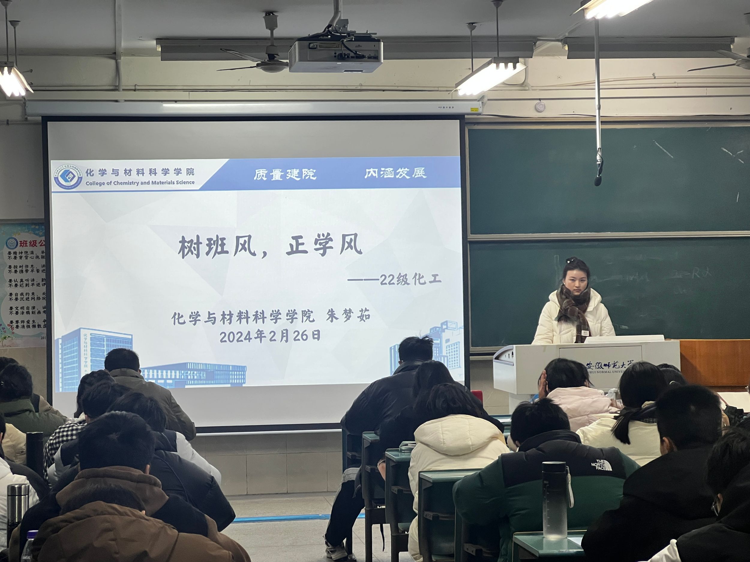 其次,朱老师提到了学风和班风建设,希望同学们准守日常行为规范,并详细列出几点内容:一是从2月27日开始正常晚自习,严禁不参加晚自习。二是晚打卡开始,寝室长发挥带头作用,督促寝室成员完成晚打卡。未完成晚打卡的同学请自觉联系老师,到办公室进行补签。三是寝室卫生、通风和消毒,垃圾“日产日清”,每周查寝前保持寝室干净。四是禁违禁电器,禁晚归不归,禁止擅自离校,禁校外租房。五是课堂文明:无愧于心,无愧于行(不迟到,不早退)。最后并强调了班级的凝聚力和团结合作的重要性,鼓励同学们要相互帮助、互相尊重,形成良好的学风和班风。朱老师还提到消防安全,让学生了解消防安全知识,度过一个平安健康的学期。