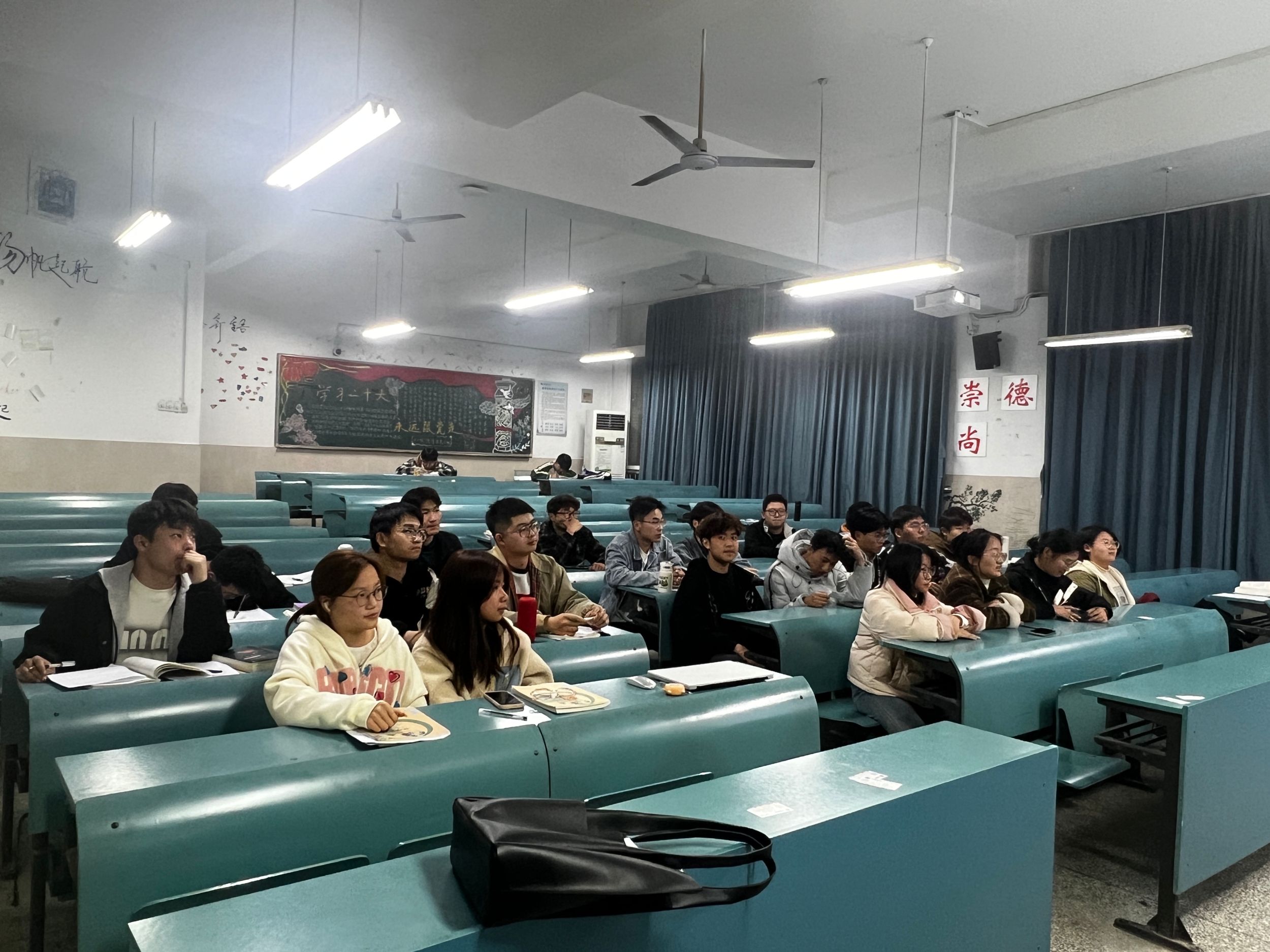 朱老师首先让各个班委上台描述上学期的本职工作和工作时遇见的问题,以便新学期更好的工作和学习,同学们也是积极说出了自己的不足和需要改正的地方。然后同学们陆续反映了近期班级同学的学习态度问题,以及任课老师的教学模式等相关问题。之后朱老师对比两个班级的绩点排名,希望落后的班级不要气馁,调制好班级学习氛围,两个班级做到齐头并进,并且建议同学们要有计划的安排好时间,有计划的学习和工作。最后由于近期同学们手机入袋情况和上课听讲情况不容乐观,朱老师和同学们共同探讨出手机入袋的新方式并让班委和寝室长督促同学们认真学习。