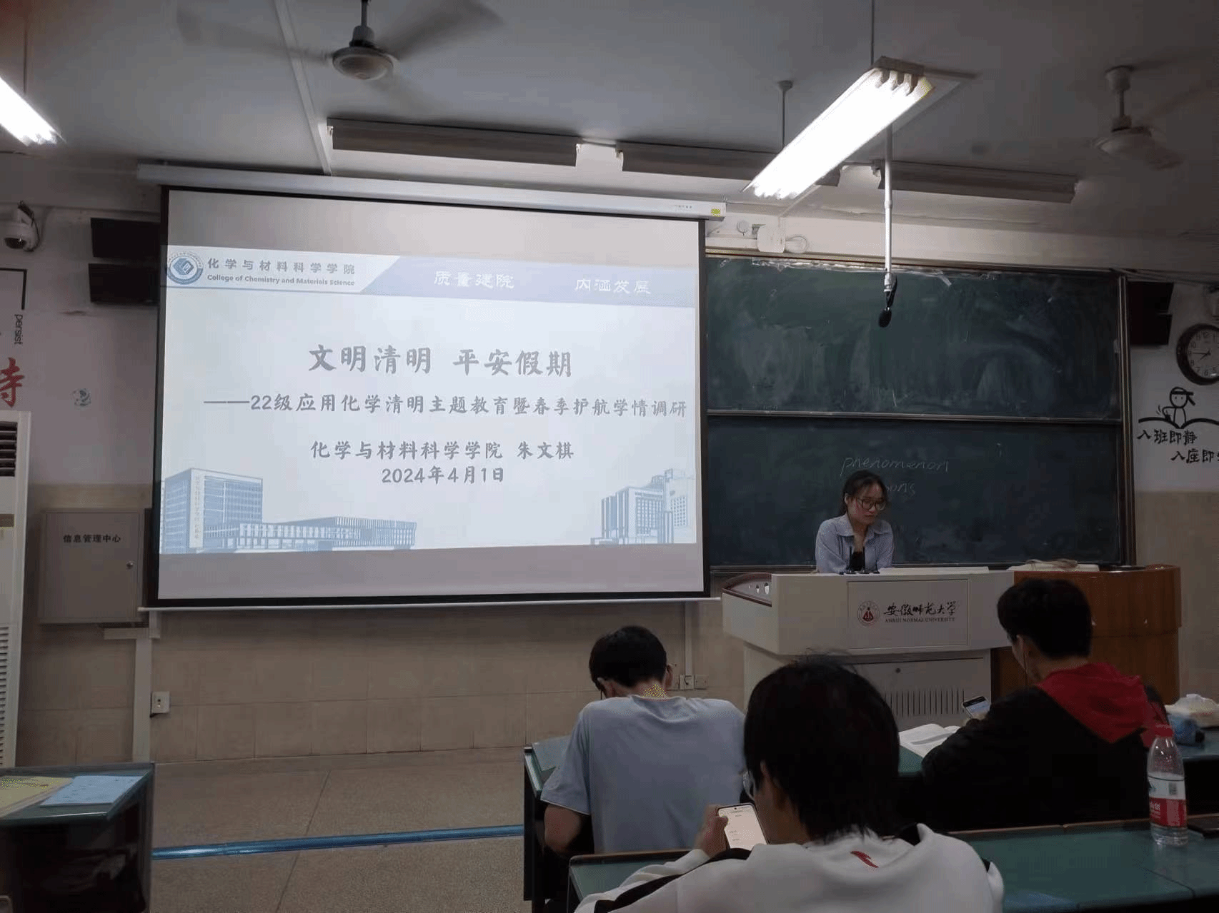 朱老师强调,安全是一切的前提。清明节假期是否离校以及请假销假都要在今日校园上登记好,另外无论是在校还是在外游玩,都要注意安全问题;留校同学要按时参与晚点名,中途如需要离开芜湖需要在今日校园履行请假手续,并向辅导员动态汇报;同时要注意规范网络行为,在网络上要时刻规范自己的言行。