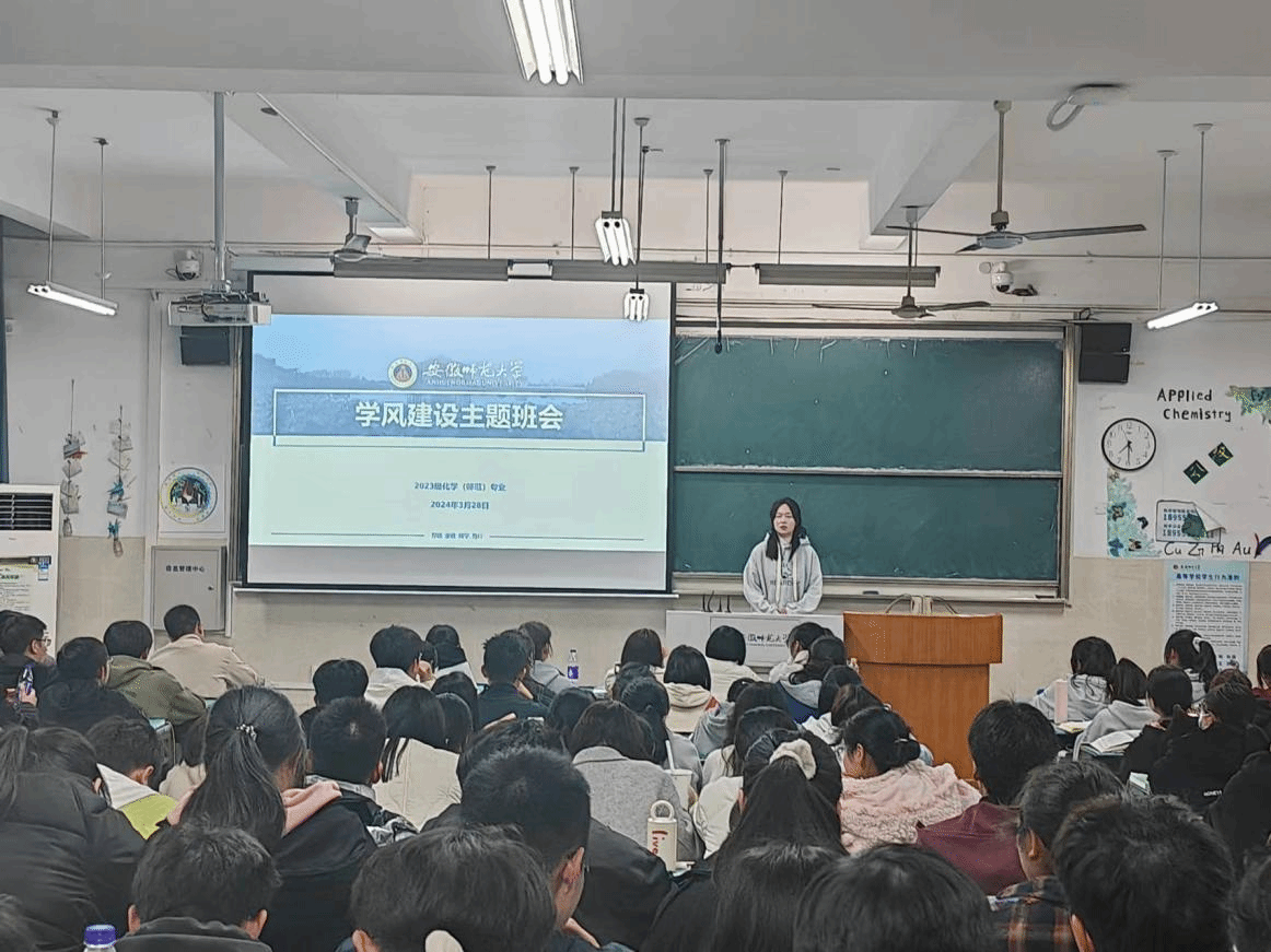 本网讯(张宏亮)为加强校风学风建设,增强学生自主学习意识,打造良好的学习氛围,2024年3月28日晚,2023级化学师范专业在行知楼1号楼开展学风建设主题班会,此次会议由辅导员王霞组织,23级化师专业全体同学均到场。