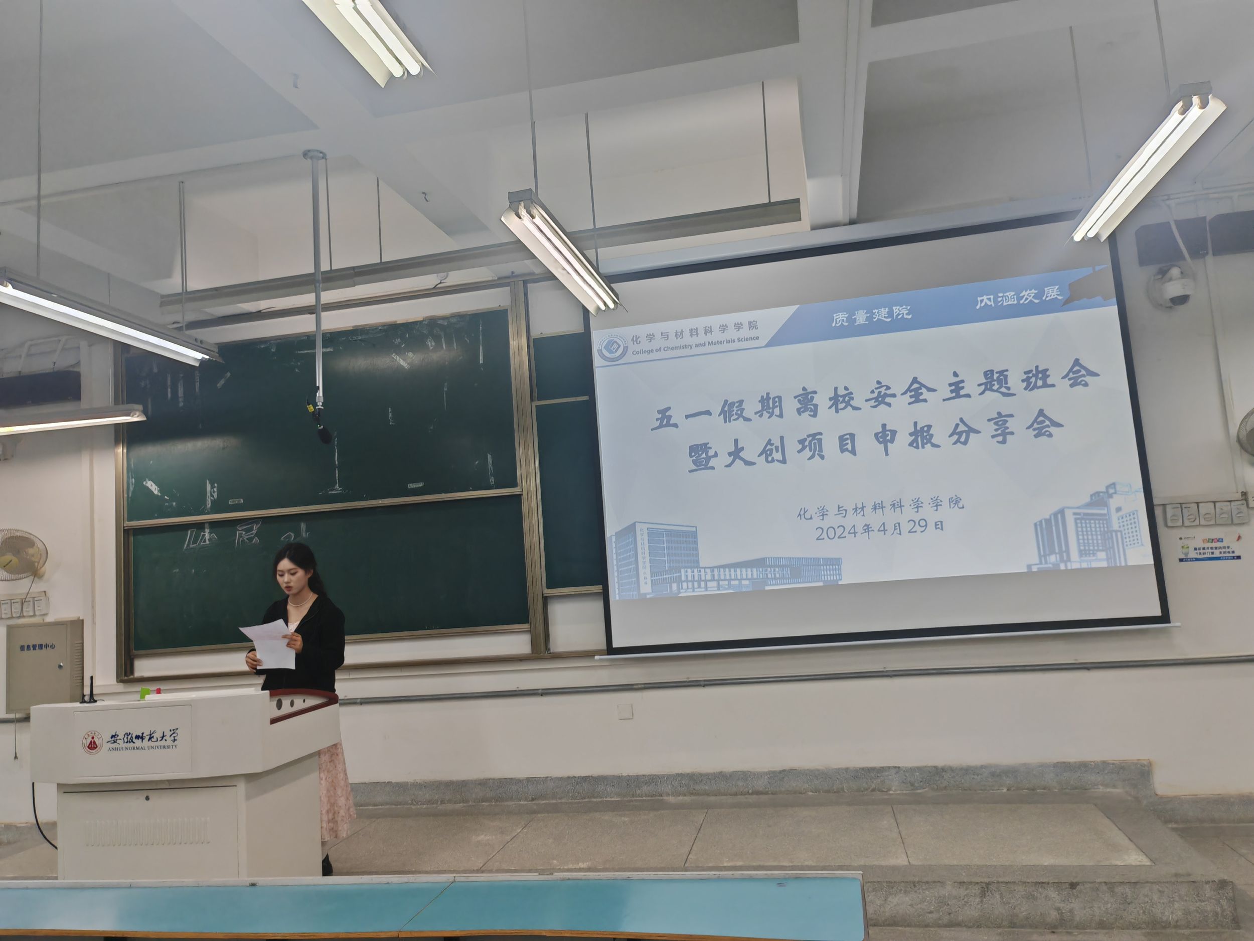 陈静)为增强学生“五一”假期的安全意识,提高学生自我防护能力,4月29日晚,辅导员陈静为22化学师范、化学非师范专业全体同学开展了2024年“五一假期安全教育暨大创项目申报分享会”。