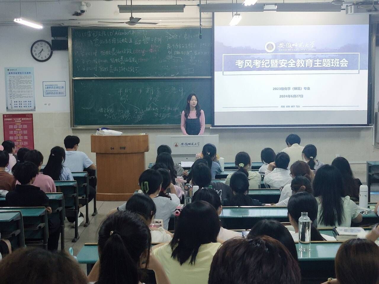 为增强学生诚实守信意识,严肃考风考纪,提升暴雨等恶劣天气的安全意识,6月27日晚,2023级化学师范专业各班在1号教学楼教室举行考风考纪暨安全教育主题班会,宣传诚信应考,加强安全教育,班会由辅导员王霞主持,全体同学参加。