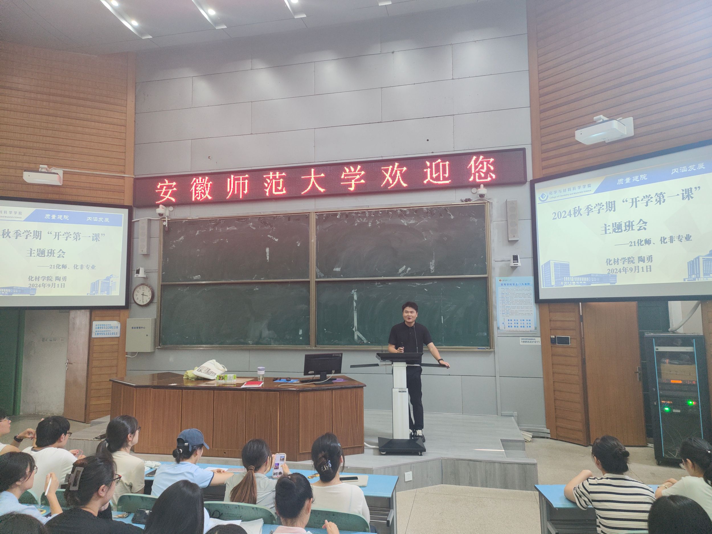 为帮助2021级本科生深入了解推荐优秀应届本科生免试攻读硕士研究生(简称“推免”)工作的相关政策,2024年9月1日下午,辅导员陶勇在2010105教室为2021级化学师范、化学非师范专业全体同学召开了2024秋季学期“开学第一课”主题班会。