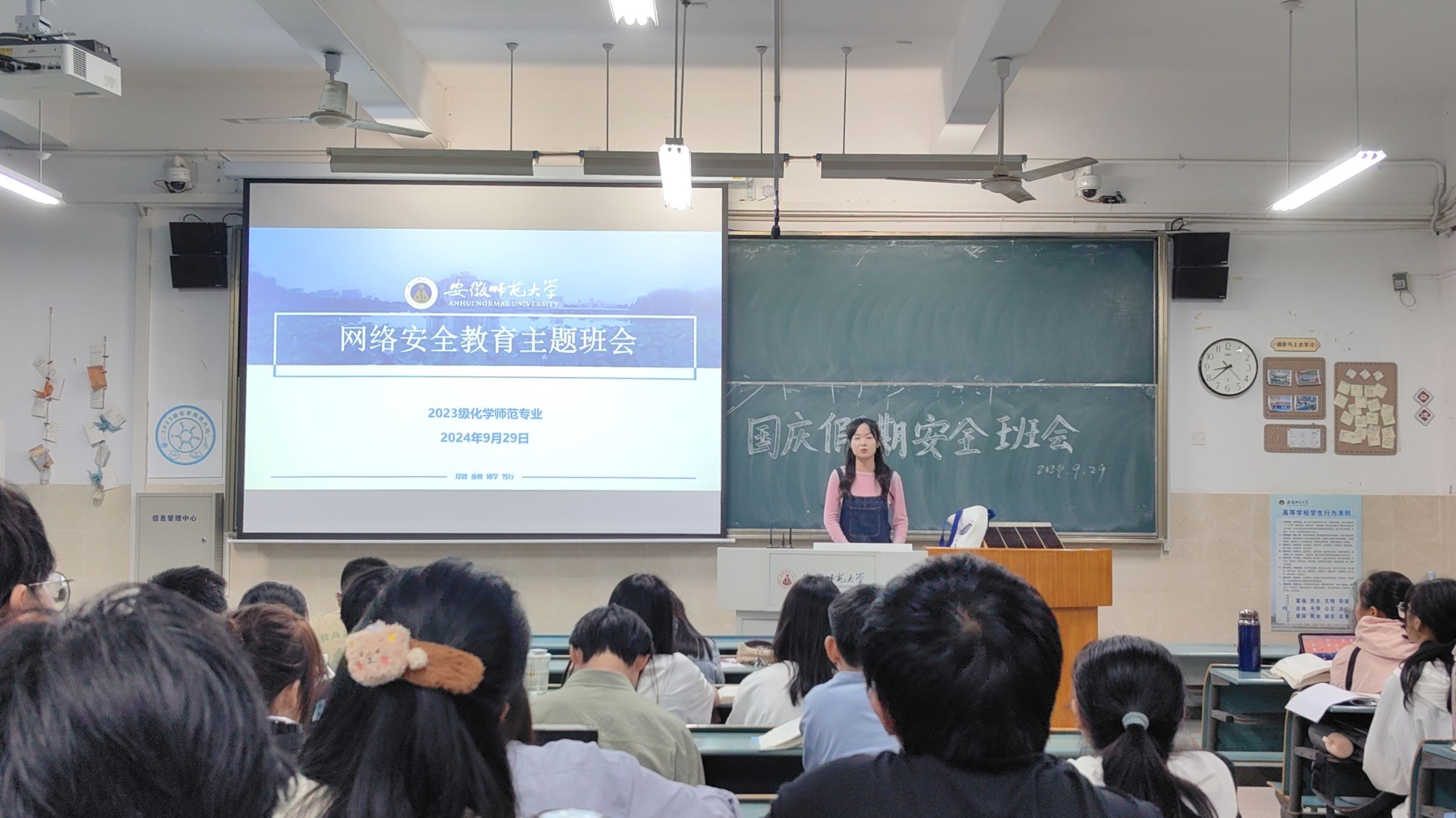 段雨含)为了积极响应国家关于加强网络安全教育的号召,提升个人网络安全意识和防护能力,促进社会网络安全环境建设,维护国家安全和社会稳定,9月29日晚上,2023级化学师范专业各班级于行知楼各教室开展了网络安全教育主题班会,全体学生参加。