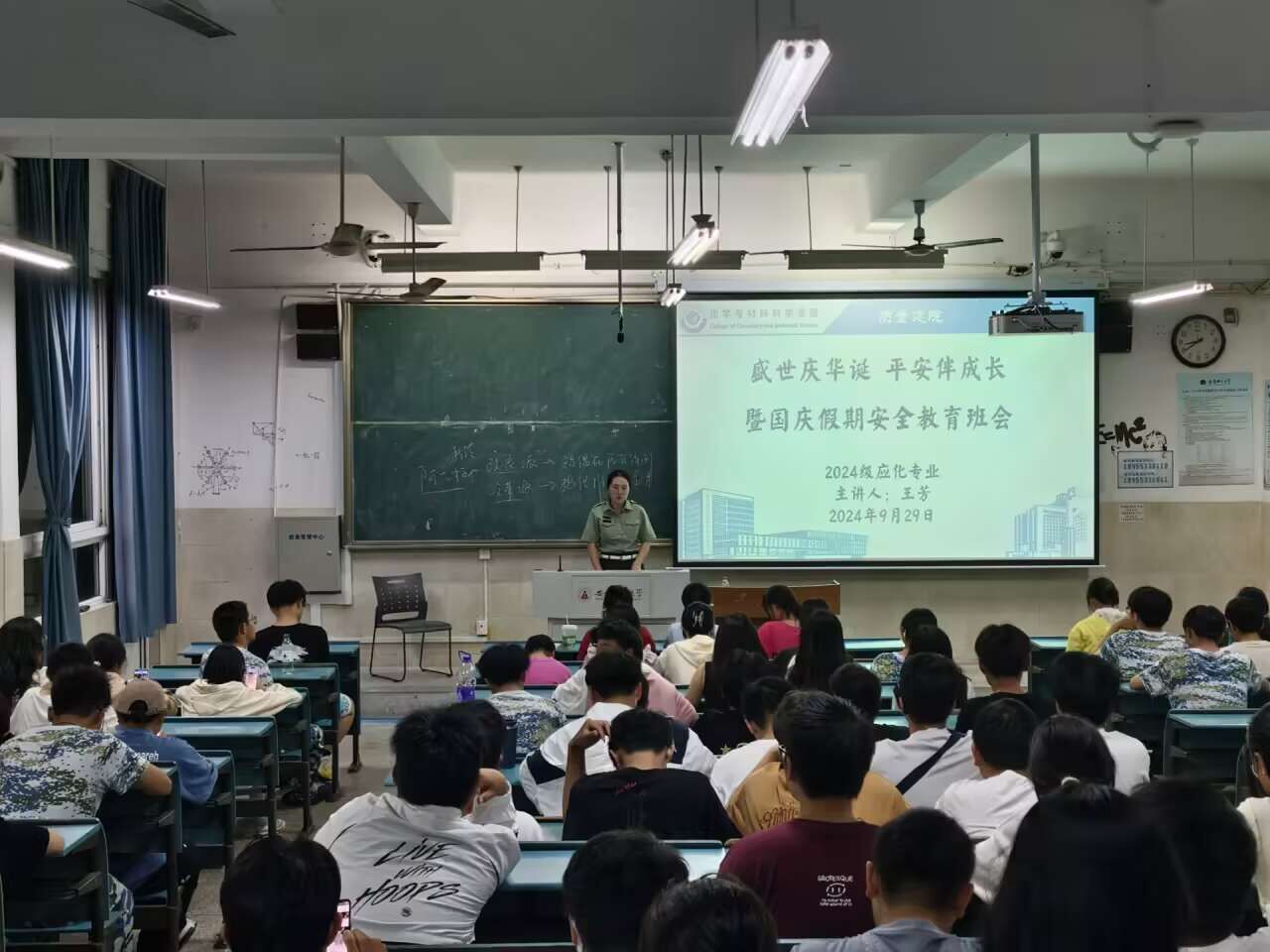 2024级辅导员王芳老师于2024年9月29日在1号教学楼2010201与2010202教室分批召开了“盛世庆华诞,平安伴成长”暨国庆假期安全与教育班会。24级新能源材料与器件,应用化学,化学工程与工艺全体同学参加。