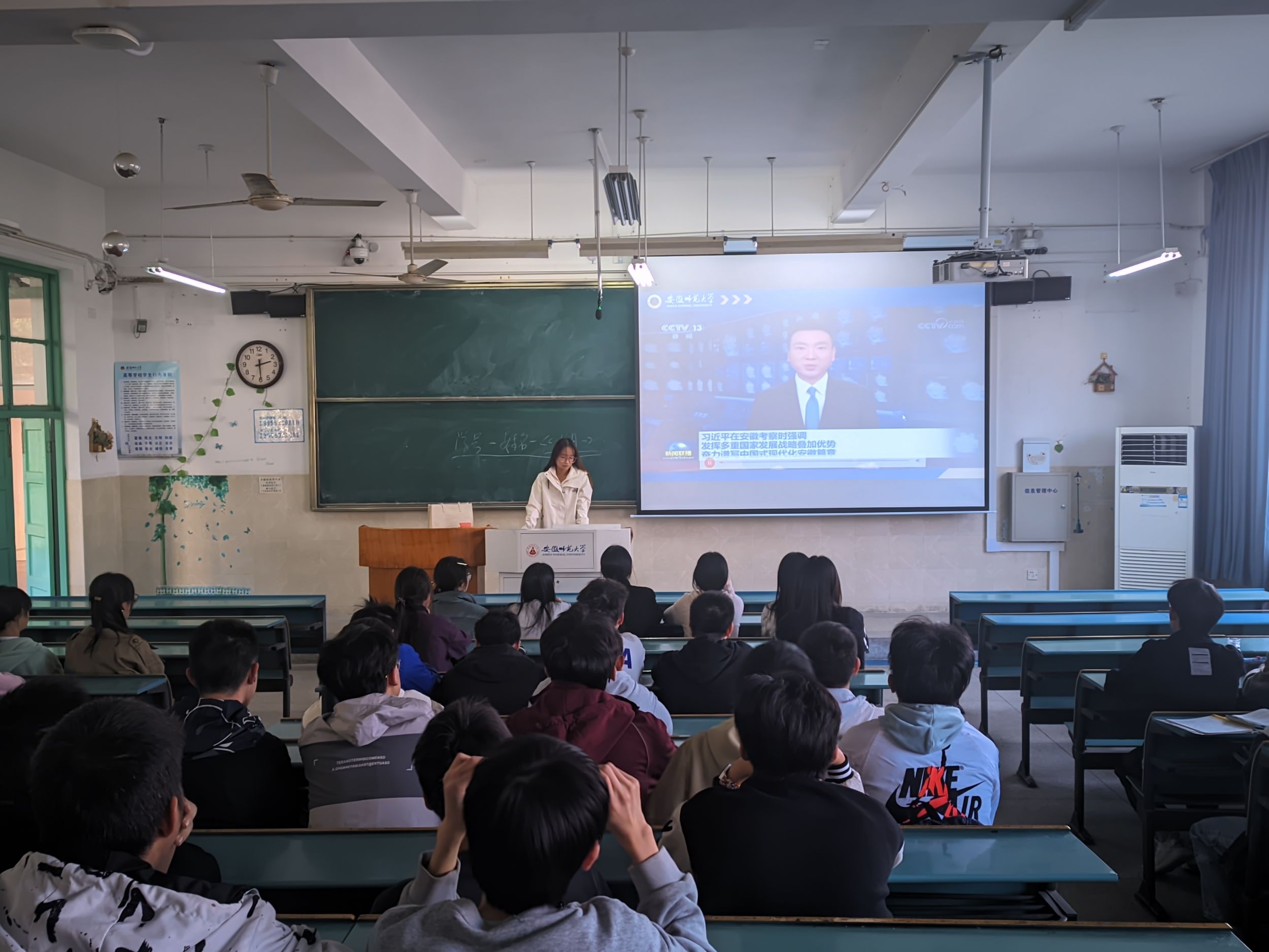 班会上,大家集中观看了习近平总书记在安徽考察时的讲话。朱老师指出,作为新时代的大学生,我们肩负着推动国家和社会发展的重任,必须积极投身到各项实践活动中去,不断提升自身综合素质,为实现中华民族伟大复兴的中国梦贡献青春力量。