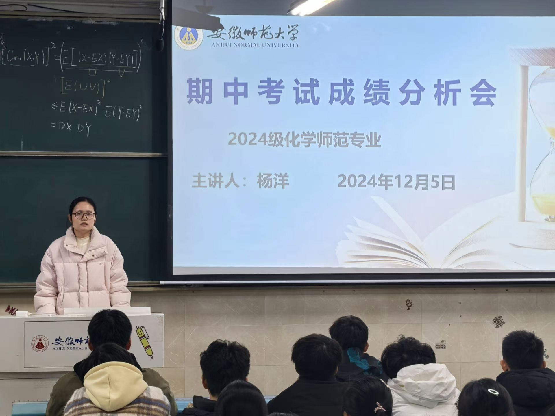 为帮助大一新生总结半学期以来的学习成果,着力解决学生学业方面的实际问题,同时为下一阶段的学习指明方向,为新生开展学业护航,2024年12月5日,辅导员杨洋老师为2024级化学师范专业召开了期中成绩分析会。