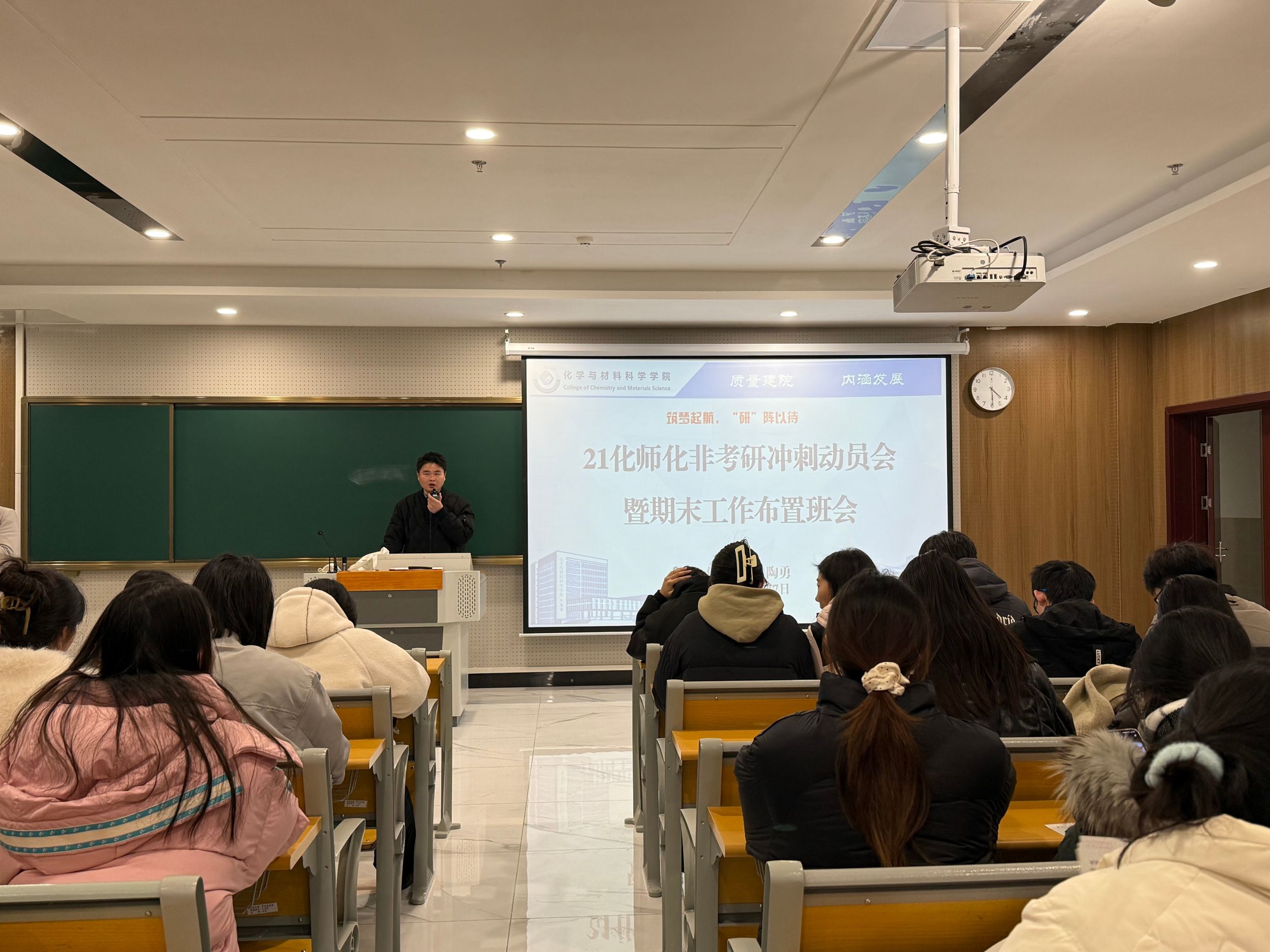 2024年12月17日,辅导员陶勇在清源楼C307教室为2021级化学师范、化学非师范专业全体同学召开了考研冲刺动员会暨期末工作布置班会。此次会议旨在激励即将参加考研的同学们全力以赴,迎接即将到来的考试,同时安排和布置期末相关工作和离校事宜,确保同学们能够顺利完成学业并安全离校。