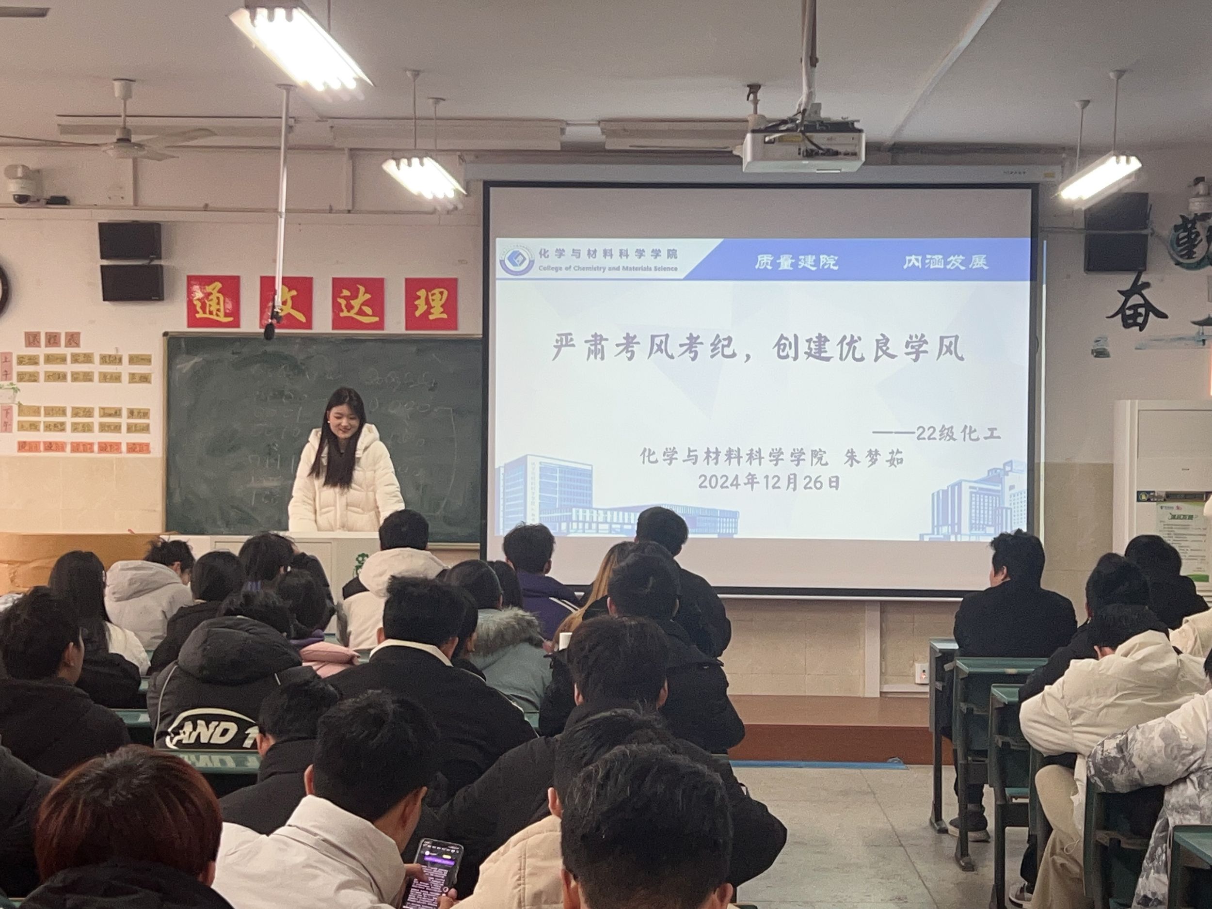 汤雷)2024年12月26日,2022级化学工程与工艺在2010605教室召开“严肃考风考纪 创建优良学风”主题班会,会议由辅导员朱梦茹老师主持,强化学生诚信意识,营造良好学风。