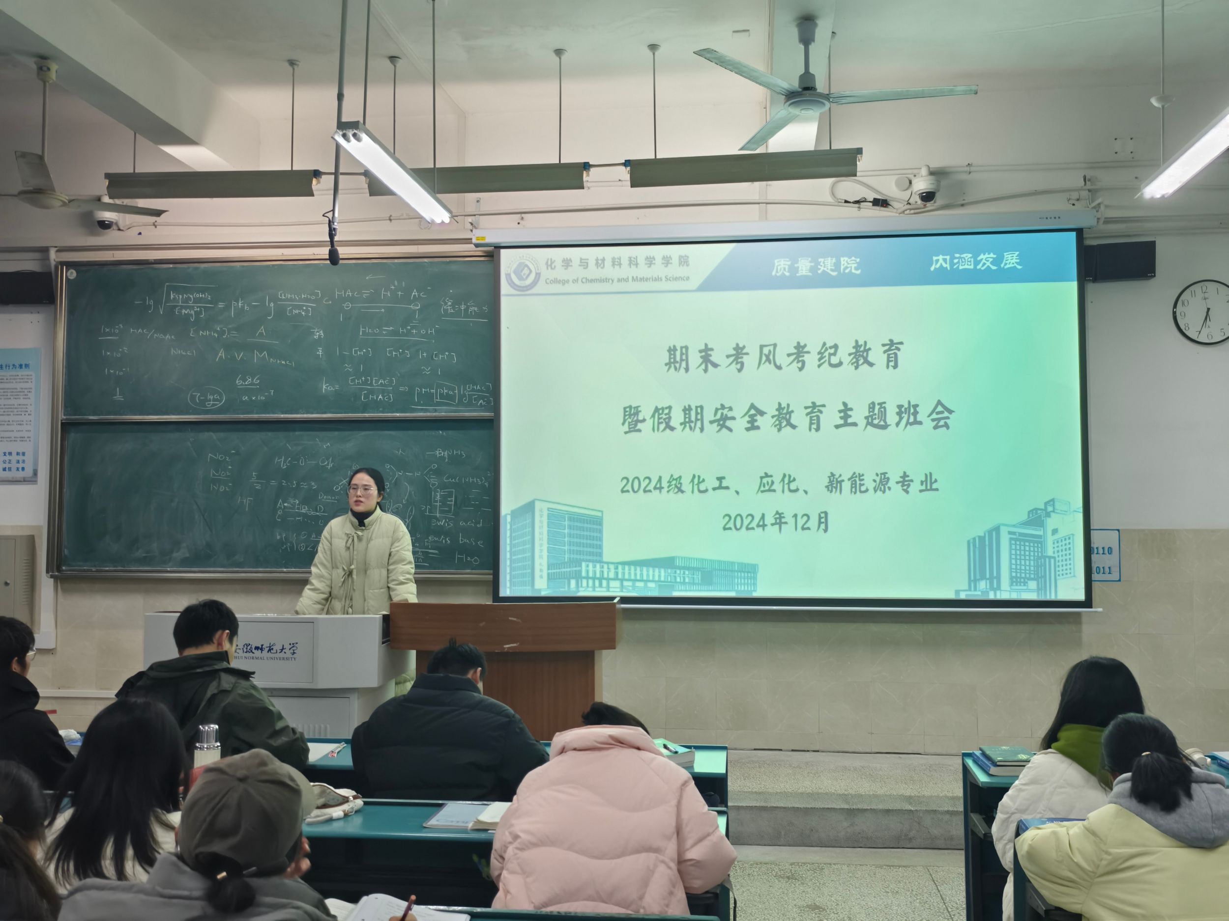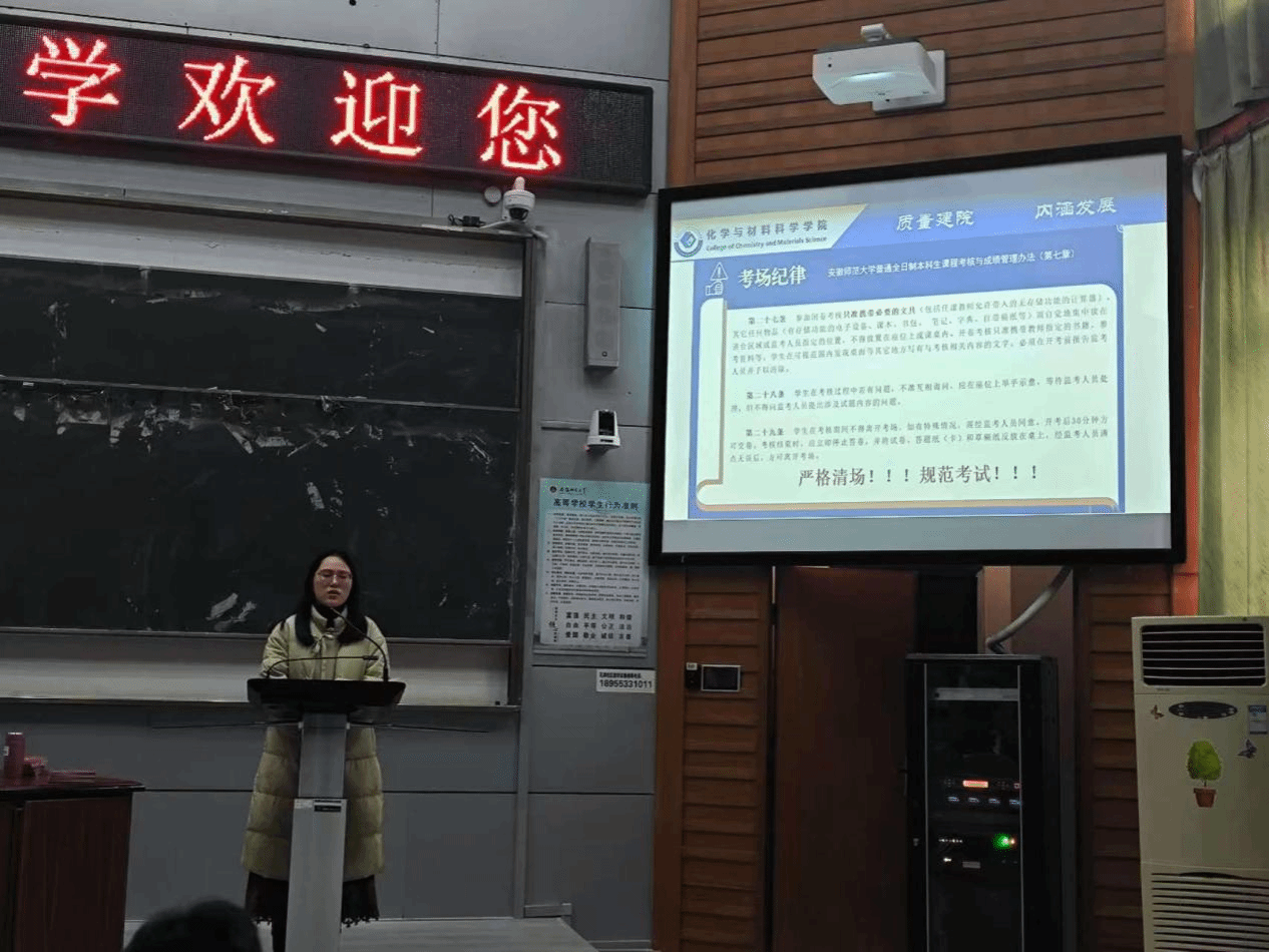 李泽宇 王芳)为了迎接期末考试,强化同学们诚信考试意识,树立优良的学风,12月26日,2024级化工、新能源及应化三个专业在行知楼2010105、2010104教室先后召开了期末考风考纪教育暨假期安全教育主题班会。会议由辅导员王芳老师主持,2024级化工、新能源及应化全体同学参加。