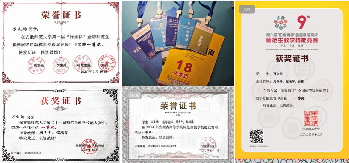 学为人师,行为世范。他在指导老师的引领下,积极锤炼师范技能,获首届“行知杯”金牌师范生授课比赛校级一等奖(本科生第一名)并作为学生代表进行直播授课,连续两年以院选赛第一名的成绩,来到省级和国家级舞台上,获安徽省师范生技能竞赛省级一等奖;第九届“田家炳杯”全国师范生技能竞赛国家级一等奖。回望竞赛生涯,累计获得校级荣誉近20项、省级荣誉4项、国家级荣誉1项,实现“院-校-省-国”四级竞赛一等奖。百余次教案迭代、千余分钟模拟授课,诠释“以赛砺能、以赛精技”的成长内核。